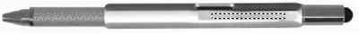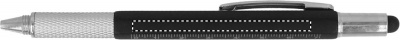 Twist action spirit level pen in ABS with ruler, stylus and phillips head and flat head screw driver bits. Black ink.
