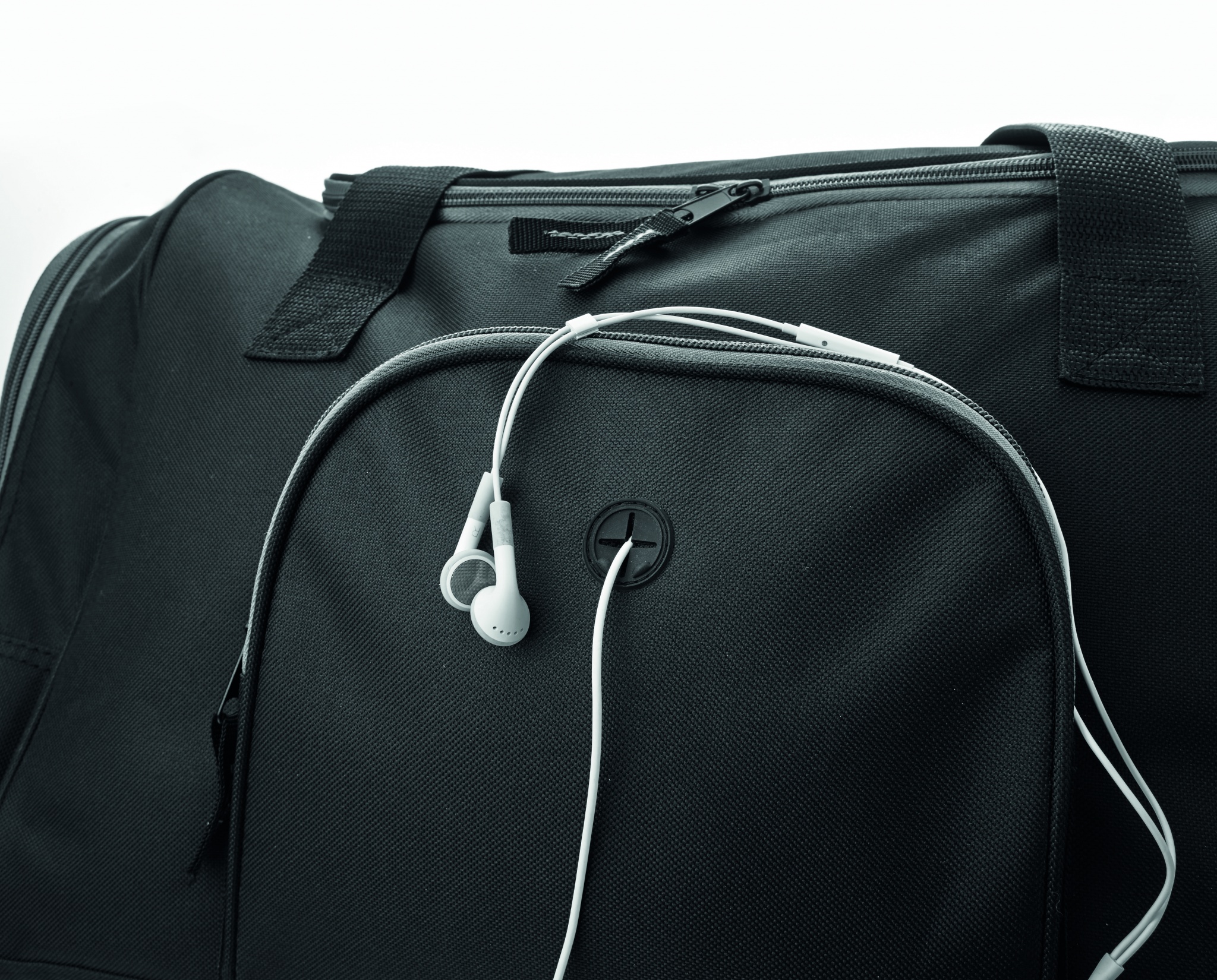 Sports bag in 600D polyester with 2 zippered side compartments and 1 zippered front pocket with earphone eyelet. Detachable and adjustable shoulder strap included.