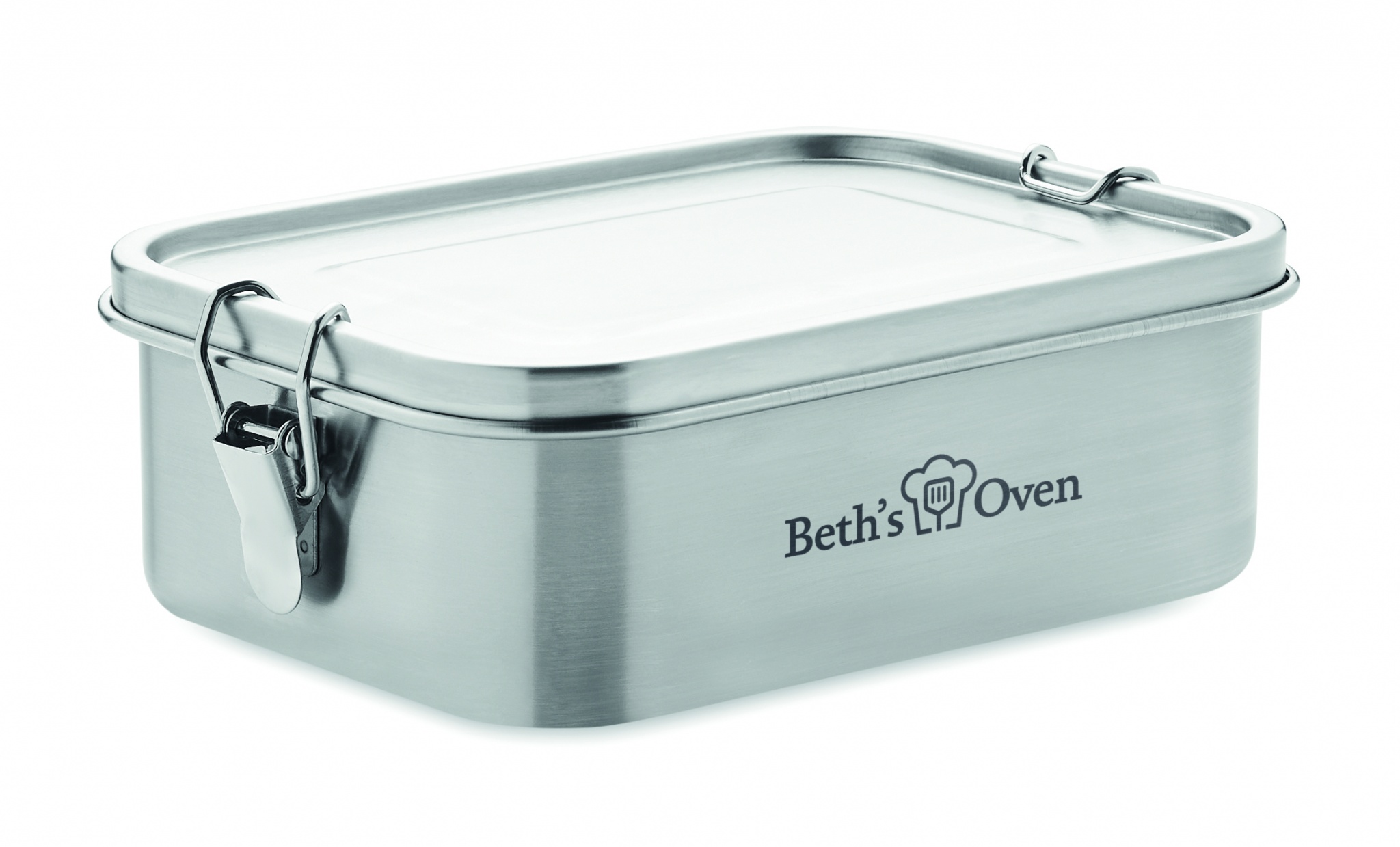Stainless Steel lunch box with strong and secure side buckles. Including inner divider. Capacity: 1200 ml.
