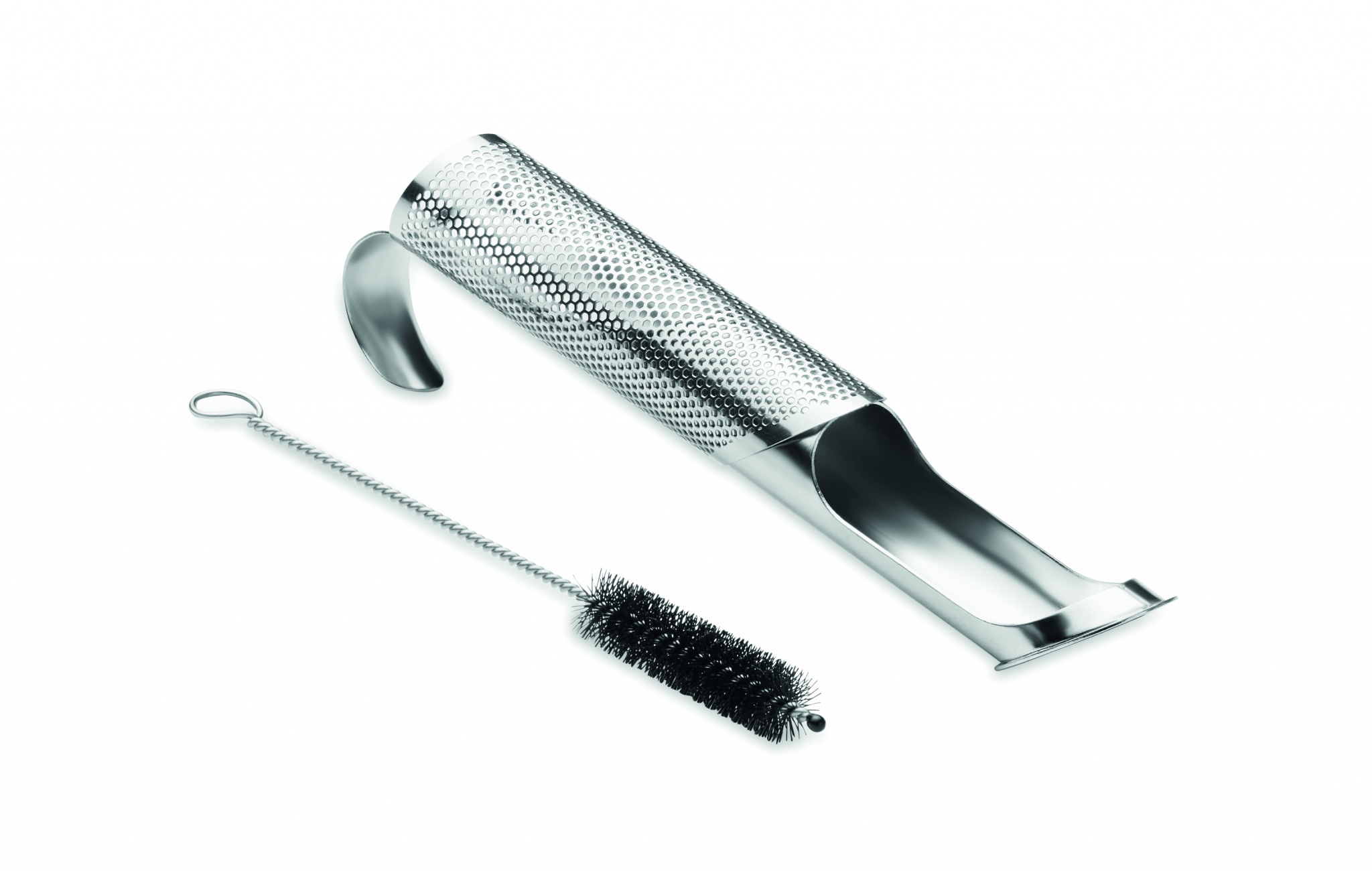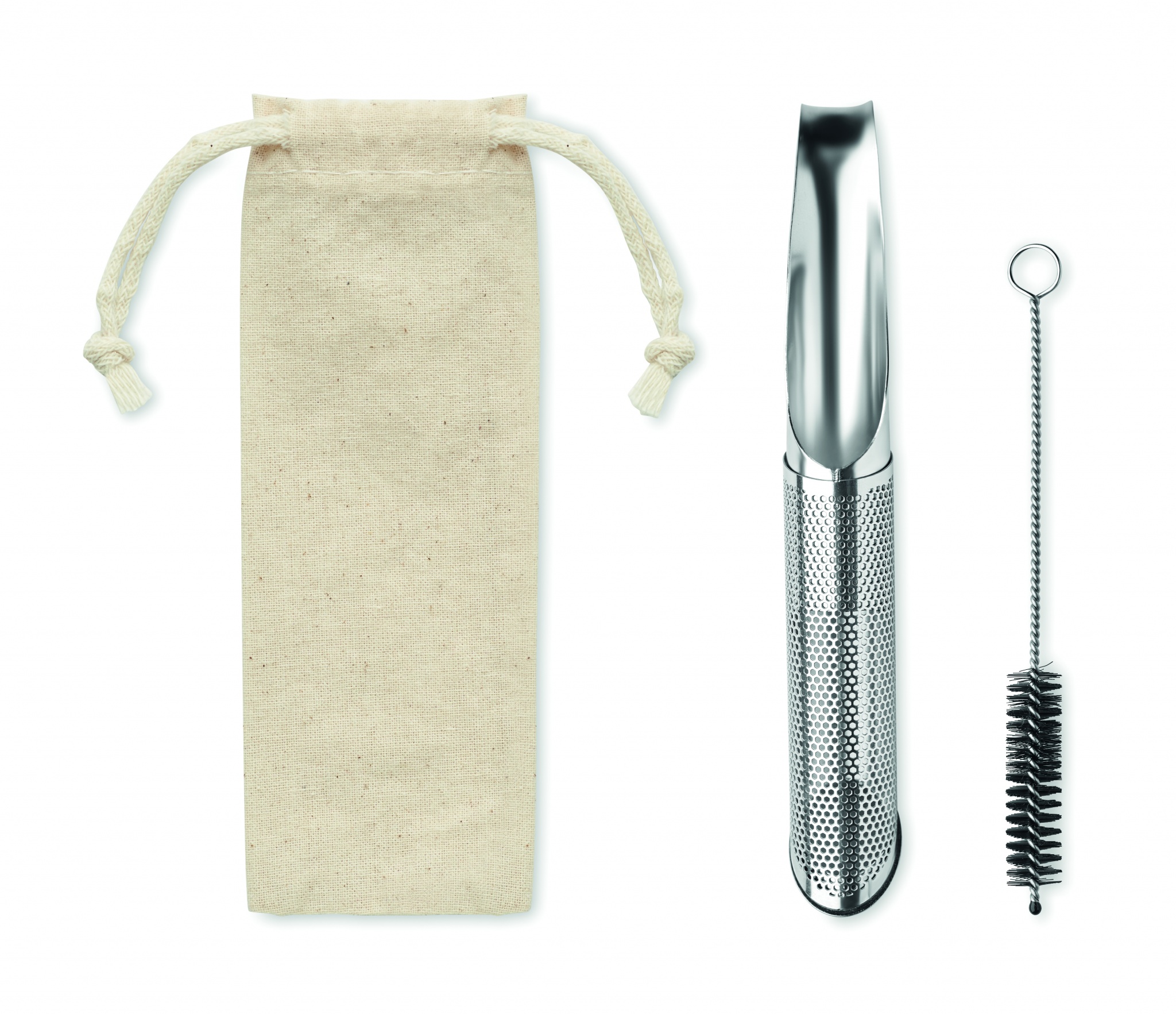 Re-usable Stainless steel pipe tea infuser set in cotton pouch. Includes tea filter with compact and curved hooked to allow it to hang over the edge of the cup or mug and cleaner brush.