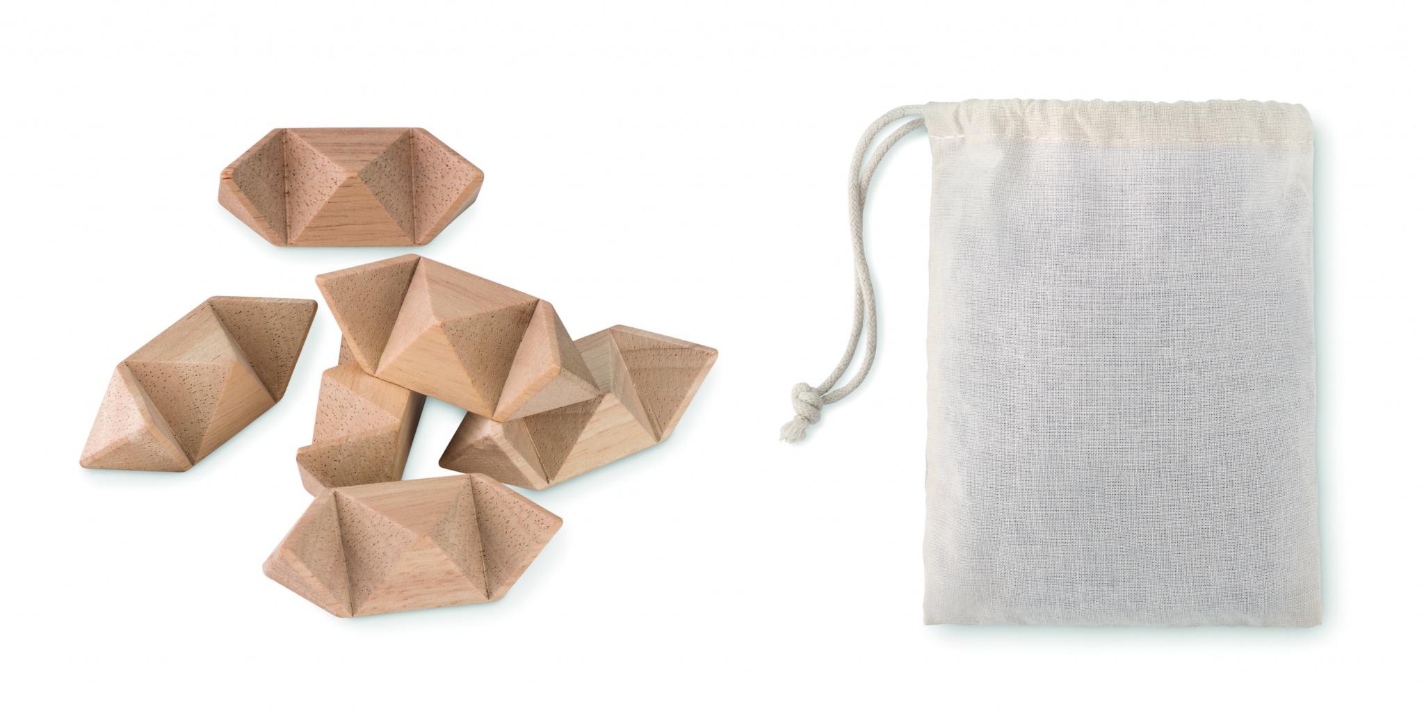 Wooden brain teaser in star shape. Presented in a cotton pouch.