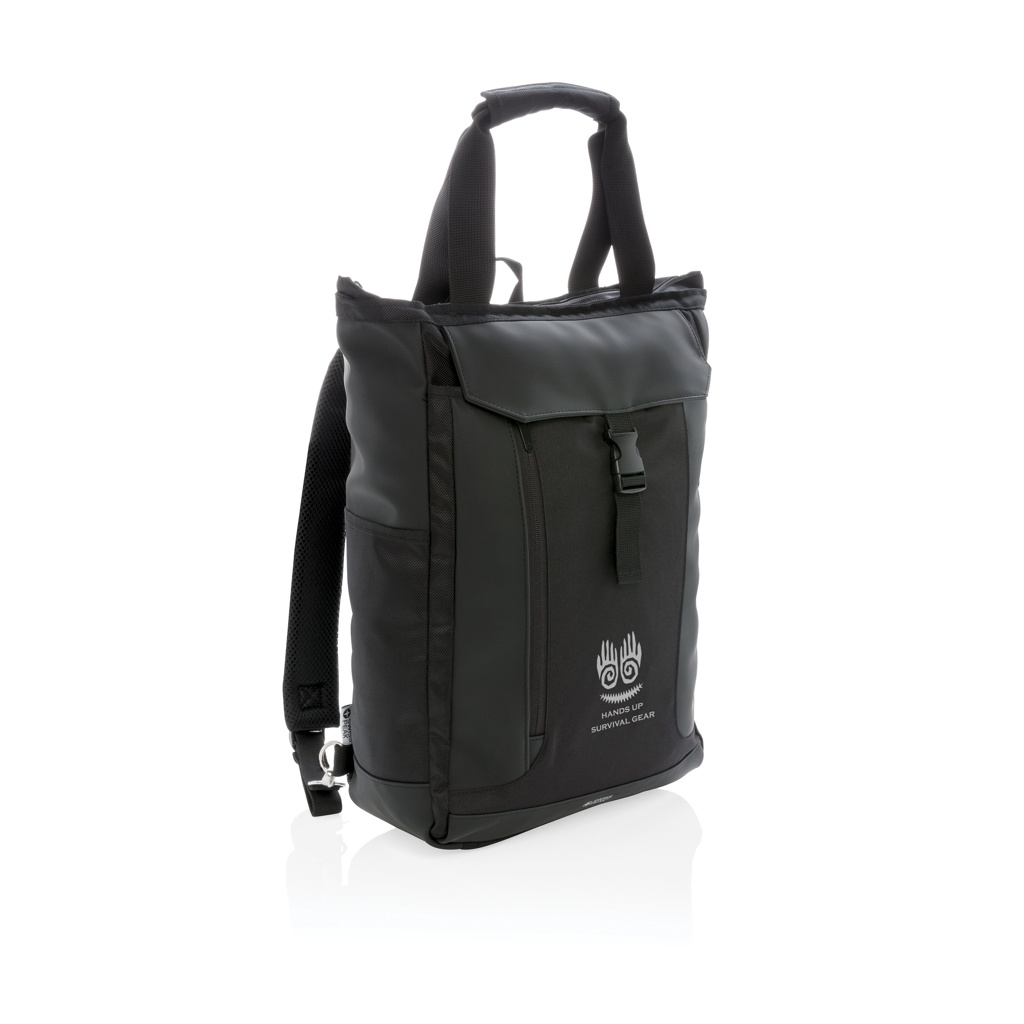 This versatile bag can be carried on the shoulder, by hand or as a backpack. Including padded 15" laptop compartment and RFID protected sleeves. PVC free.