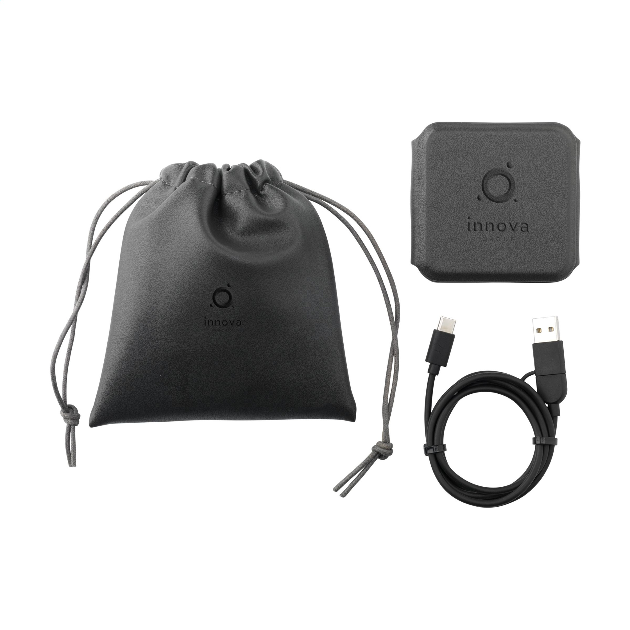 Foldable 3-in-1 fast charger made from recycled PU. The ideal wireless charger for quickly charging your phone, earphones and smartwatch simultaneously. Foldable and compact. Equipped with a magnetic Apple Watch section for wireless charging 2.5 W. TWS earphones have a wireless output of 3 W. Input: Type-C 9V/3A. Wireless output: 15 W. This charger can be used anywhere and is ideal to take with you when travelling. Includes protective case made of recycled PU with drawstring. Includes a black rTPE charging cable Type-C connection and A/C connector, as well as a handy set of instructions. RCS certified. Total recycled material: 44%. Each item is supplied in an individual brown cardboard box.