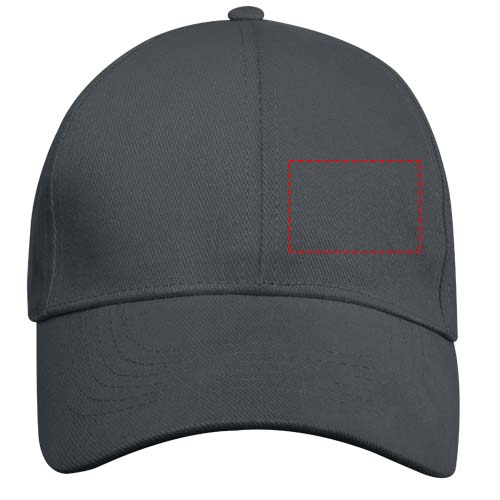 Sustainable promotional headwear. Pre-curved visor. Embroidered eyelets for ventilation. Tri-glide metal buckle closure. Head circumference: 58 cm.