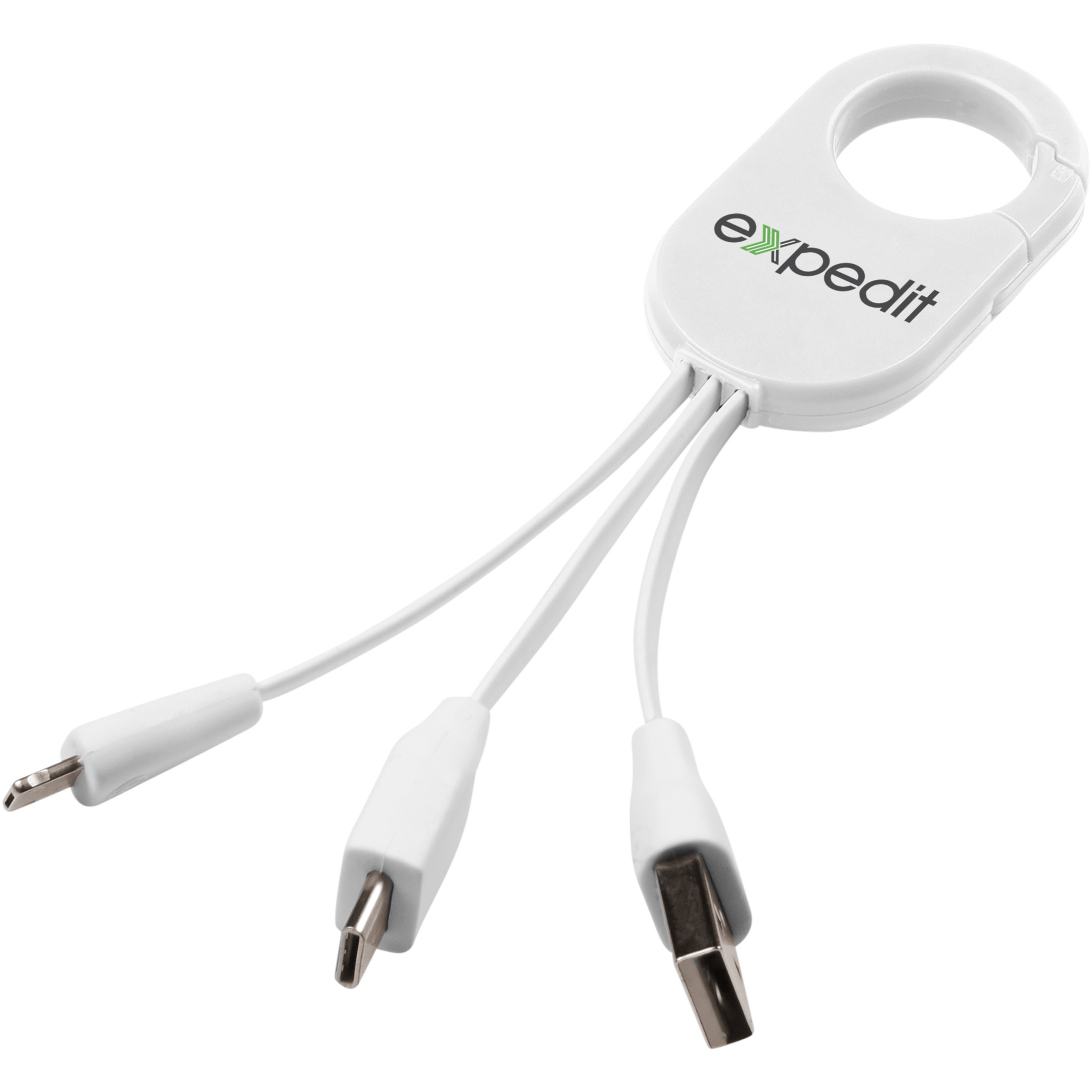 The Troop 3-in-1 charging cable features a USB type C tip and a 2-in-1 dual compatible tip for both Apple® iOS and Android devices. It has a carabiner clip to easily hook on your bag.