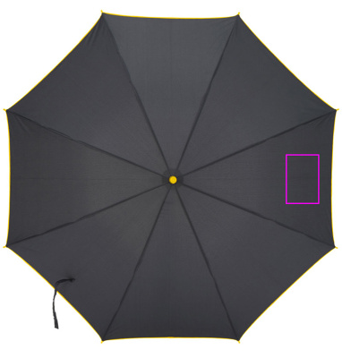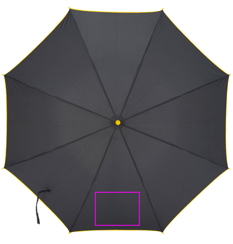 Automatic umbrella made of 190T pongee with fiberglass poles, plastic handle, colored rim, handle and frame. We print your logo on one segment.