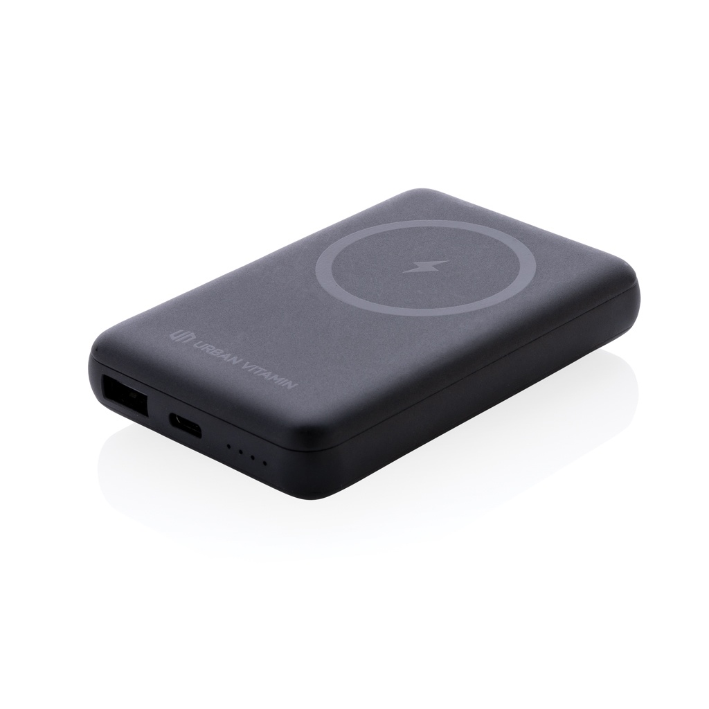 Fully charge your phone with this fast charging powerbank. The slim and compact powerbank has an integrated fast 10W wireless magnetic charger. Features a versatile built-in foldable kickstand that keeps your phone upright for a comfortable viewing angle. Thanks to the ultra fast type C 20W PD port, the powerbank re-charges in record time. Charging your phone up to 50% takes only 30 minutes. Slow charging is something from the past. The powerbank contains a long lasting A-grade 5000 mah battery to charge all your devices on your travels and adventures. Made with RCS (Recycled Claim Standard) certified recycled ABS Total recycled content: 18 % based on total item weight. RCS certification ensures a completely certified supply chain of the recycled materials. Urban Vitamin items are made without PVC and packed in plastic reduced packaging. USB-A :5V 3.0A,9V 2.0A, 12V 1.5A Type C : 5V 3.0A,9V 2.22A, 12V 1.5A (PD20W)