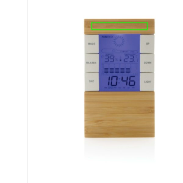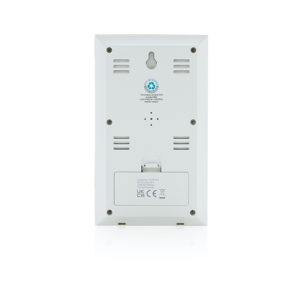 Weather station made with RCS (Recycled Claim Standard) certified recycled ABS and FSC® 100% bamboo. Total recycled content: 42 % based on total item weight. RCS certification ensures a completely certified supply chain of the recycled materials. With LCD screen. Functions: temperature, humidity, time, weekday, date, temperature. Including aaa batteries for direct use. Packed in FSC® mix kraft box.