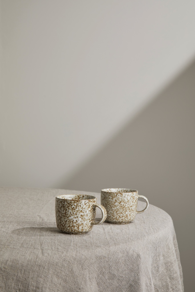 Two-piece set of mugs in stoneware, a must-have addition to any dining table. With its unique, organic uneven shapes and hand-glazed finish, each piece is one-of-a-kind and sure to impress your guests. Crafted from durable stoneware, it is designed to last and withstand the wear and tear of daily use. These mugs are dishwasher-safe for easy cleaning and maintenance. Not suitable for use in the microwave or oven.