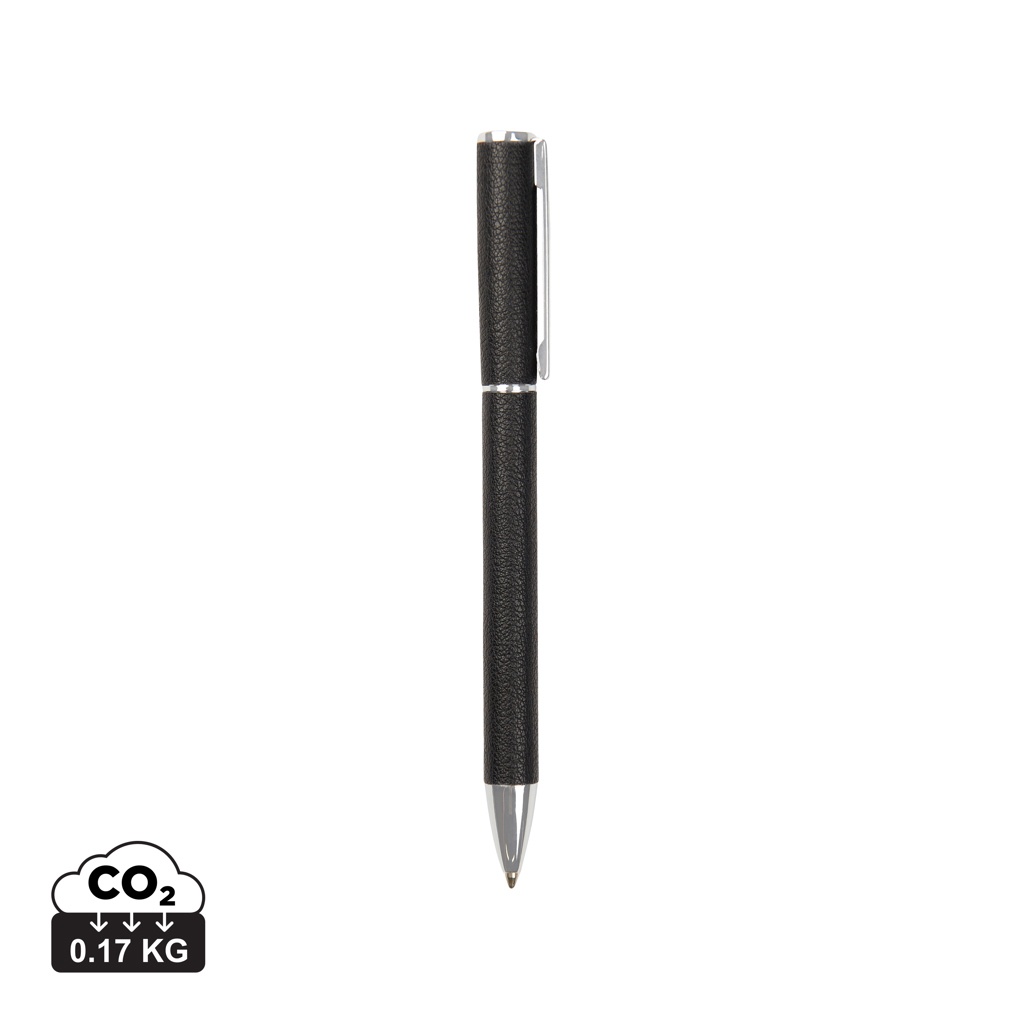 A sleek writing instrument featuring a twist-action mechanism with documental-based blue ink, providing around 1200-metre writing length and a 1.0 mm writing width. Crafted with a recycled aluminium barrel, brass components and PU material. The Timo series offers minimalist desk accessories made from RCS-certified recycled materials, blending elegant design for a modern workplace aesthetic. Certified by RCS (Recycled Claim Standard), RSC certification guarantees that the entire supply chain of recycled materials is certified. The total recycled content is based on the overall product weight. This product contains 27% RCS certified recycled aluminium.
