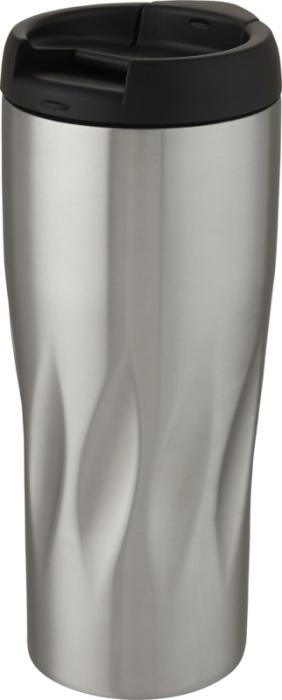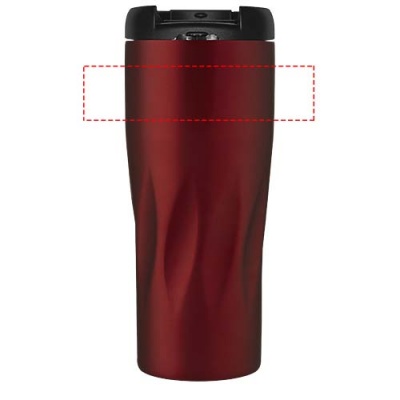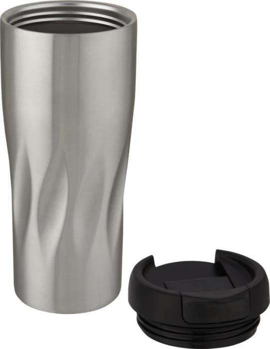 Double-walled copper vacuum insulated tumbler with screw-on leakproof lid featuring a wavy geometric design. The insulated 18/8 stainless steel keeps drinks hot or cold for several hours. BPA-free and tested and approved under German Food Safe Legislation (LFGB), and tested for phthalates content according to REACH regulations. Volume capacity is 450 ml. Hand wash recommended. Presented in a recycled cardboard gift box.