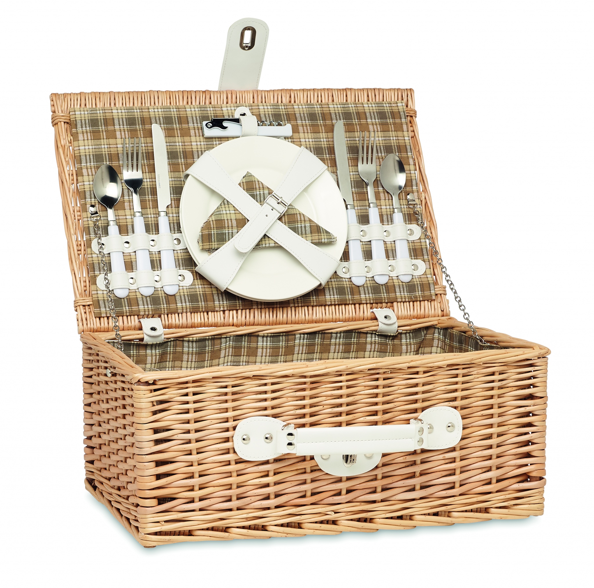 Wicker 2 person picnic basket set with 1 bottle opener, 2 stainless steel spoons, forks and knives, 2 ceramic plates, 2 glasses and 2 polycotton napkins.