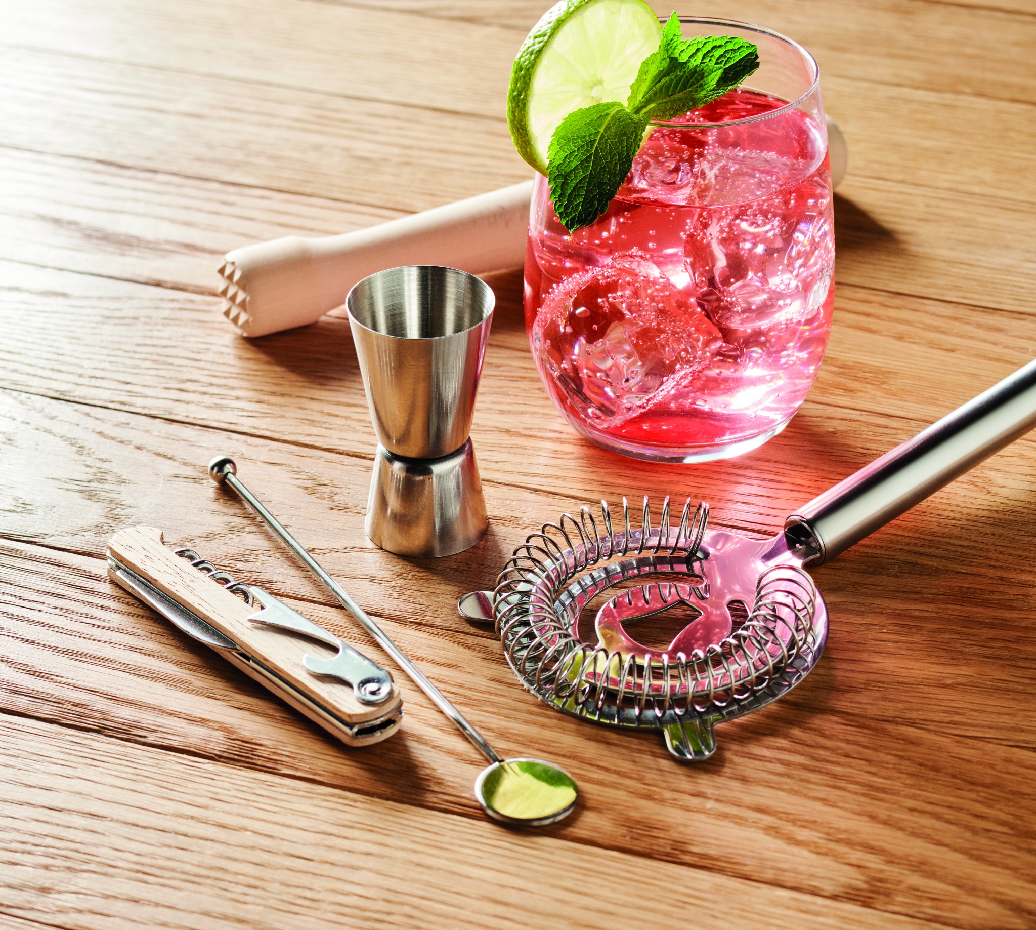 Kokteilikomplekt puuvillases nööriga kotikeses. Sisaldab 5 tükki: kahepoolne mõõtepulk (15 ja 30 ml), puidust segaja, kokteilisõel, joogisegaja ja kelneri korgitser nuga.