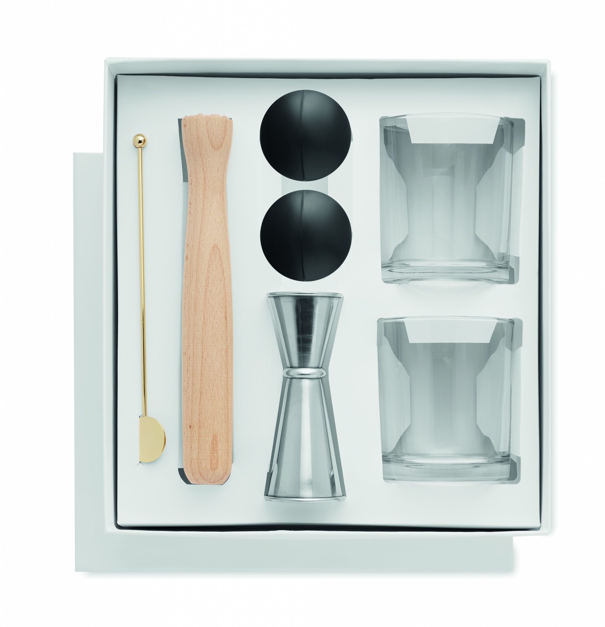 Kokteiliklaasi komplekt. Sisaldab 7 tükki: kaks trumlit, kahepoolne roostevabast terasest jigger (25&50 ml), puidust segaja, roostevabast terasest joogisegaja ja kaks kerakujulist silikoonist jäävormi.