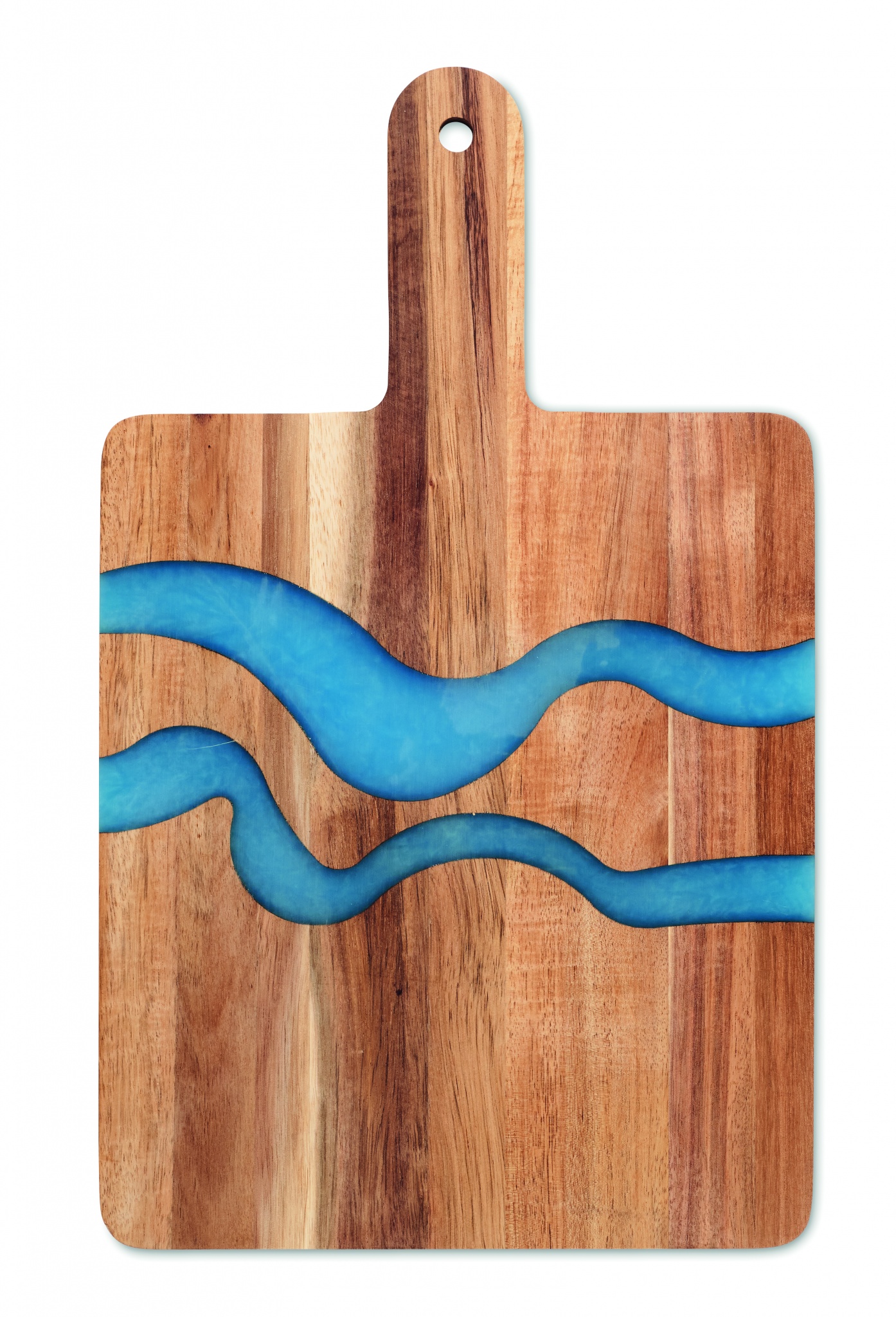 Akaatsiapuidust serveerimislaud epoksüvaigu detaili ja käepidemega. Puit on looduslik toode, ühe eseme värvis ja suuruses võib esineda väikesi erinevusi, mis võivad mõjutada lõppviimistlust.