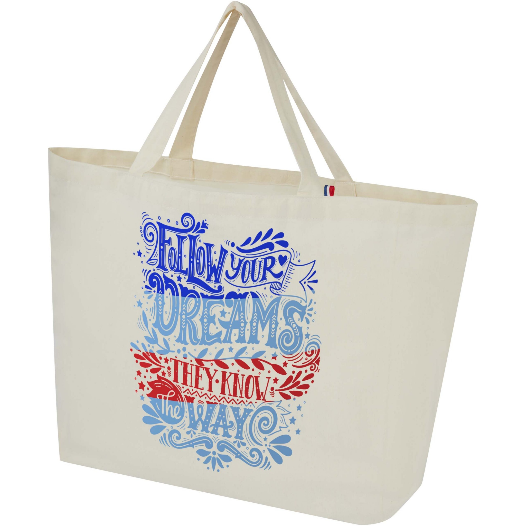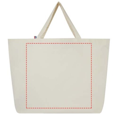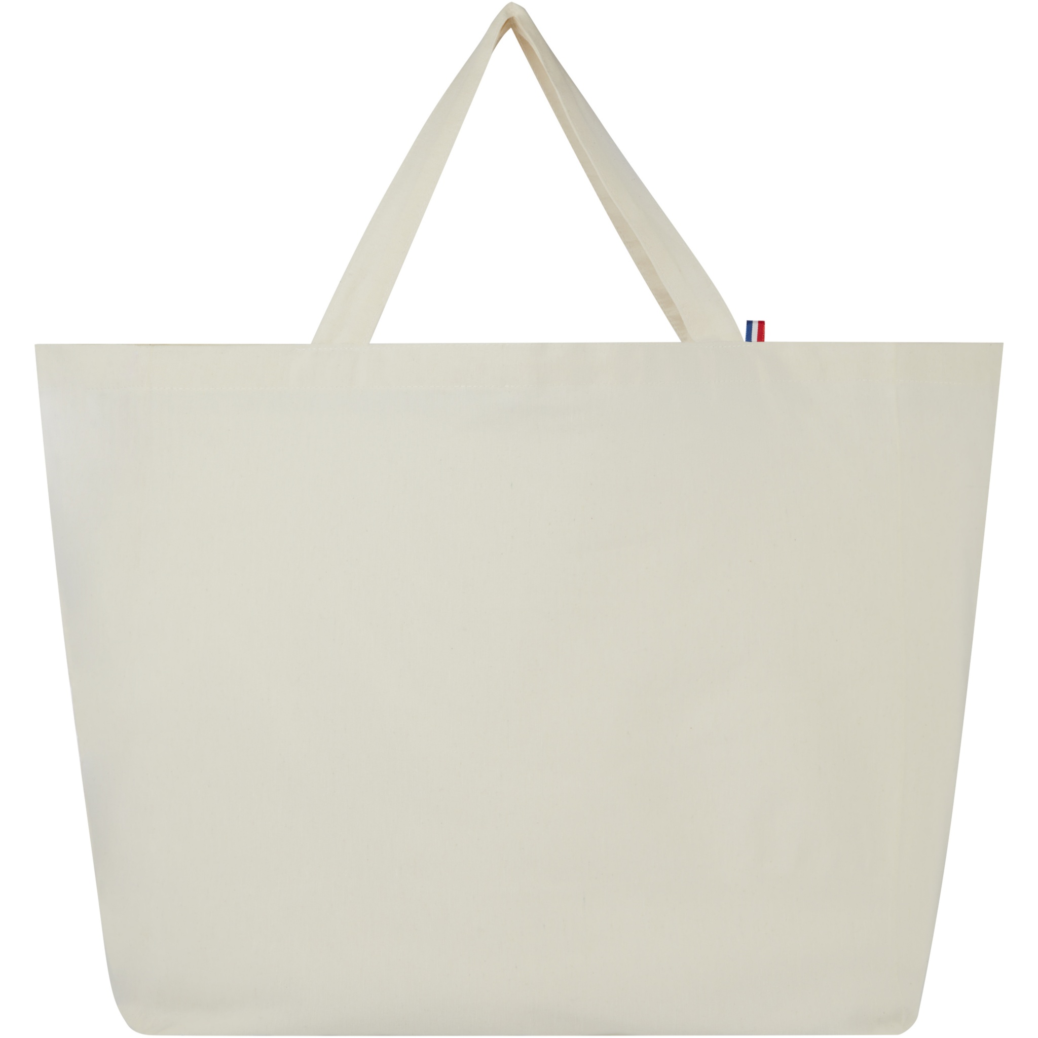 See suure mahutavusega kandekott on valmistatud parimatest, 100% taaskasutatud materjalidest. See on ehitatud igapäevaelus kasutamiseks ja sobib raskete raamatute või toidukaupade kaasaskandmiseks. 200 g/m² taaskasutatud puuvilla/polüestri segu tagab vastupidavuse ja töökindluse, andes kotile vastupidavuse kuni 14 kg kaalule. Lõngad pärinevad Aasiast, kuid kudumine, ketramine ja tootmine toimub Prantsusmaal.