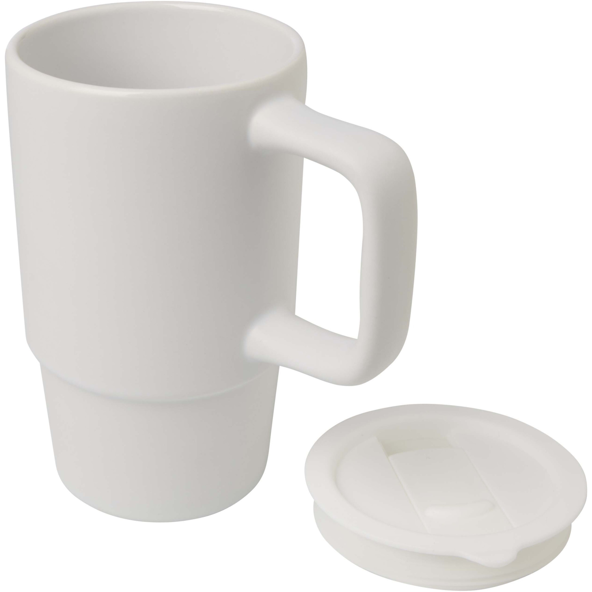 Keraamiline kruus, millel on suur käepide ja pritsmekindel plastikust kaas. Pakendatud taaskasutatud papist kinkekarpi. Mahutavus: 450 ml.