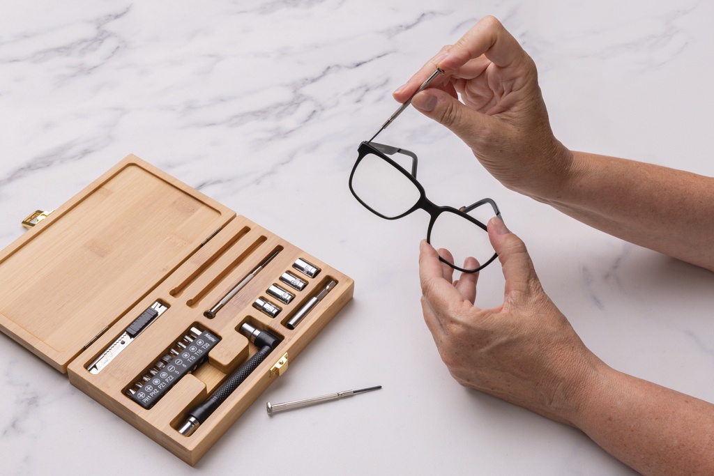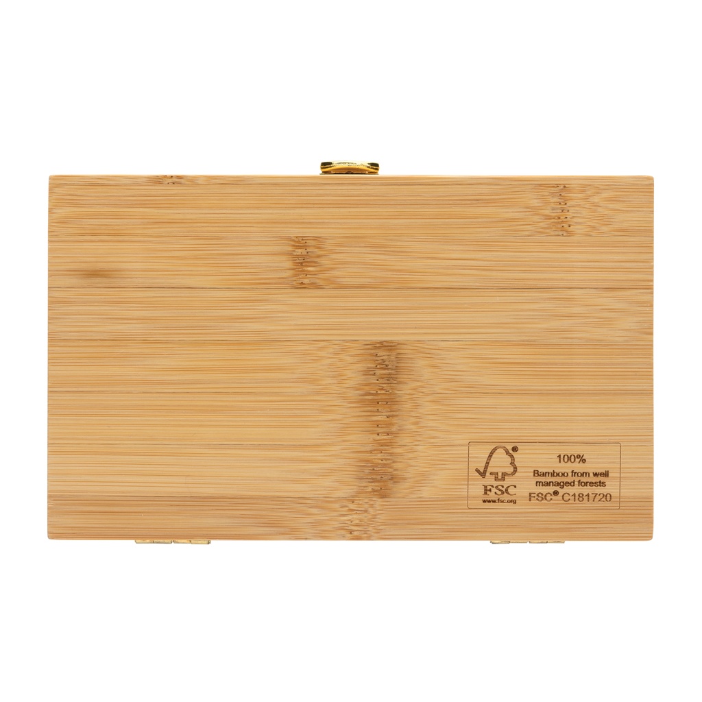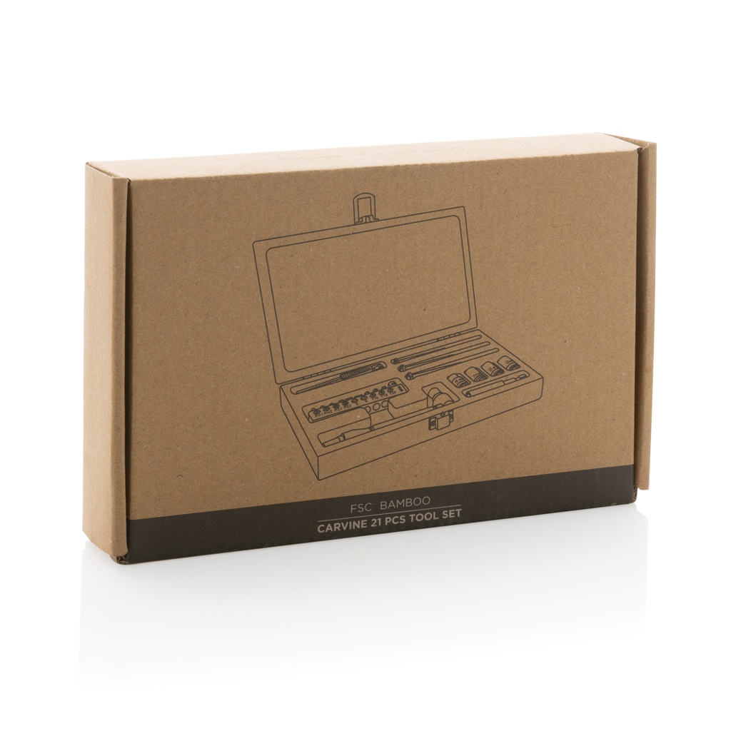 21 tk tööriistakomplekt luksuslikus FSC® 100% bambusest korpuses. Komplektis on 3 kruvikeerajat, 10 otsikut hoidikus, 4 pistikupesa, 1tk käepide, 1tk pistik, 1tk väike lõikur. Pakitud FSC® mix kraft pakendisse