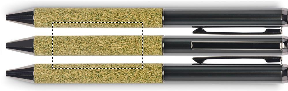 Keeratav metallist pastapliiats kangaga korpusel, mis on valmistatud 20% teepaksust, 30% korgist ja 50% polüpuuvillast. Pappkarbis. Sinine tindiga.