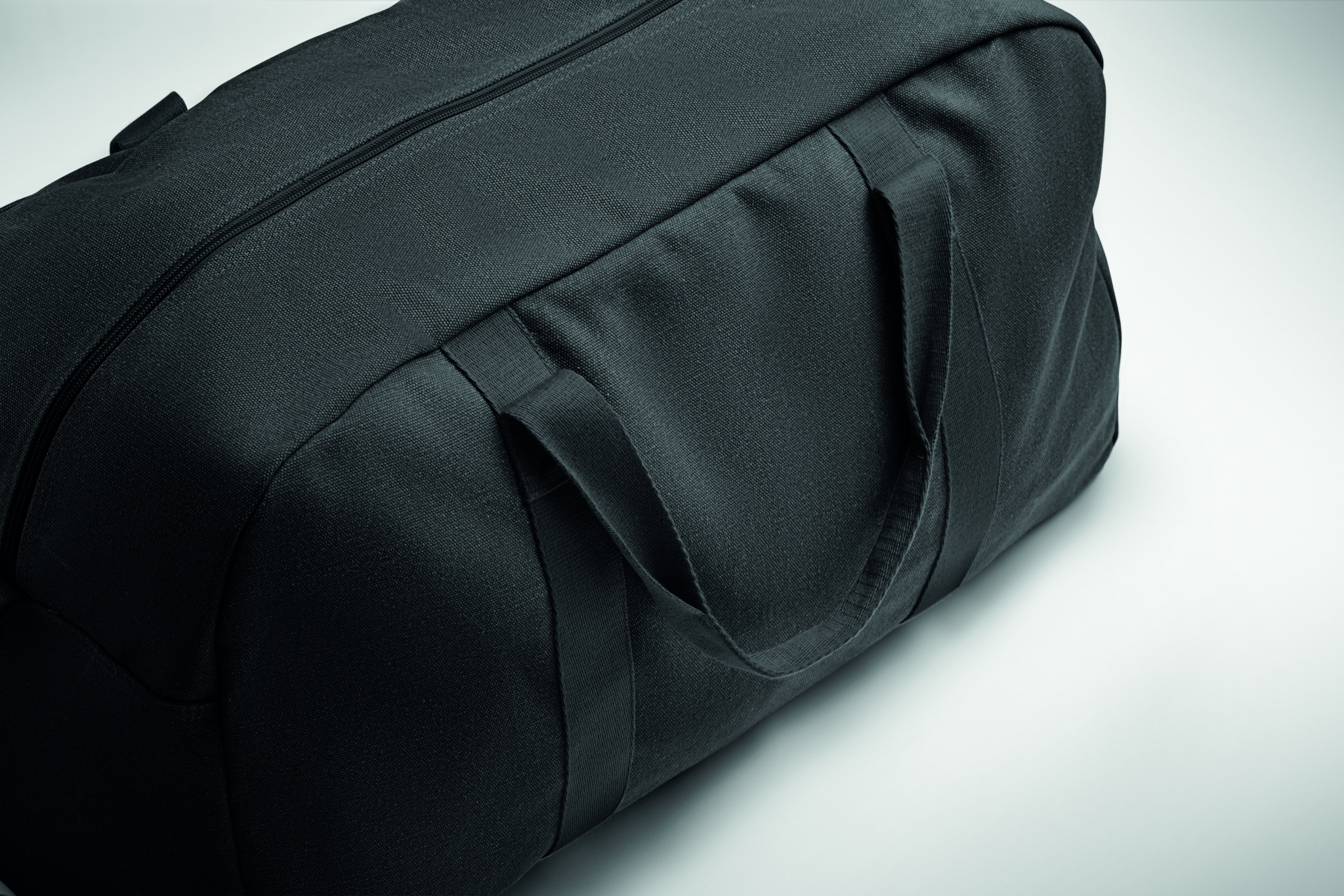 Must taaskasutatud 450 gr/m² kangast (60% taaskasutatud puuvill ja 40% taaskasutatud polüester) reisikott reguleeritava ja eemaldatava puuvillase rihmaga.