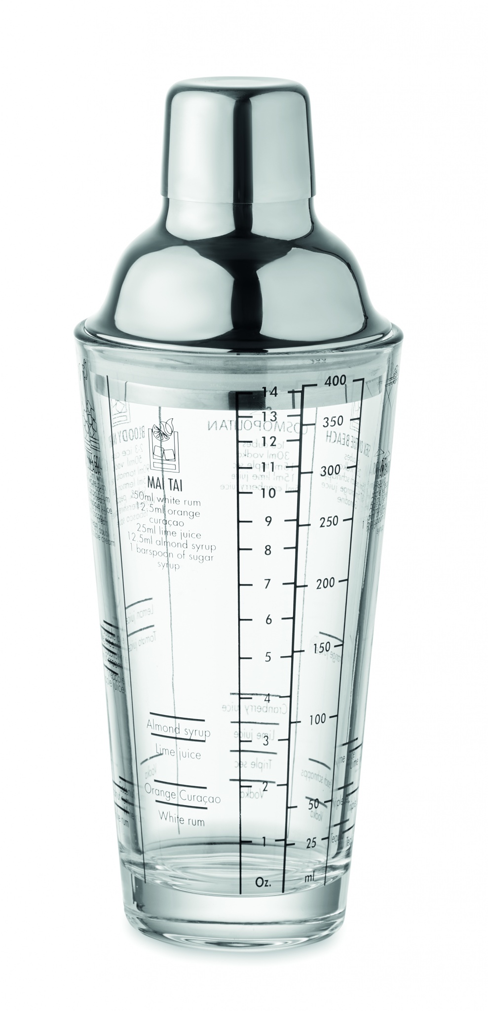 Roostevabast terasest kaanega klaasist kokteilišeiker koos kurnaga. Klaasile trükitud kokteiliretseptid ja mõõdud. Mahutavus: 400 ml.
