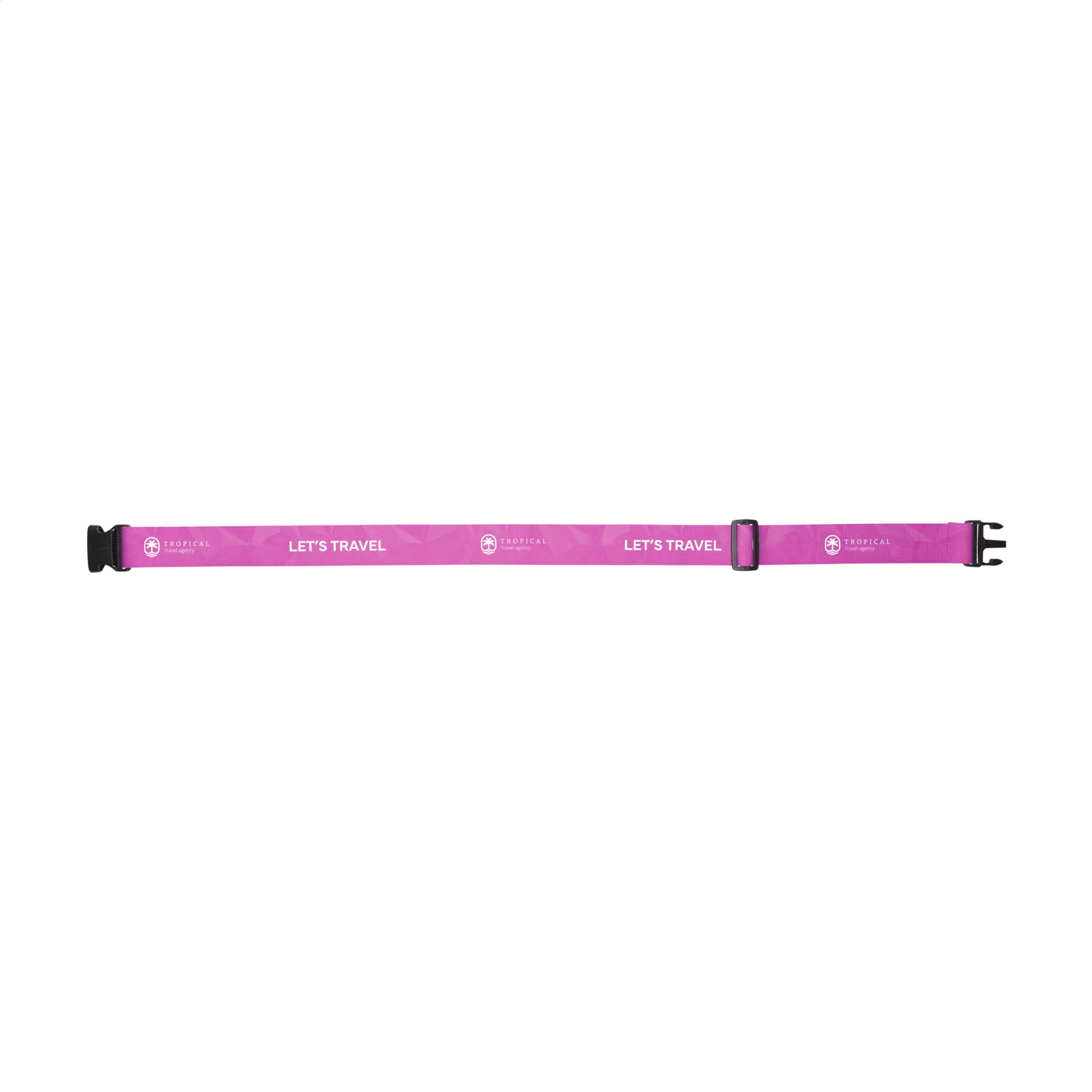 Tugevast polüestrist valmistatud pagasirihm plastikust klõpsava kinnisega. Sisaldab isikupärastatud täisvärviprinti mõlemal küljel. Võimalik ka erineva kujundusega esi- ja tagaküljel. Reguleeritav minimaalselt 130 cm ja maksimaalselt 190 cm. Lai rihm tagab teie kohvrile lisatugevuse ja äratundmise.