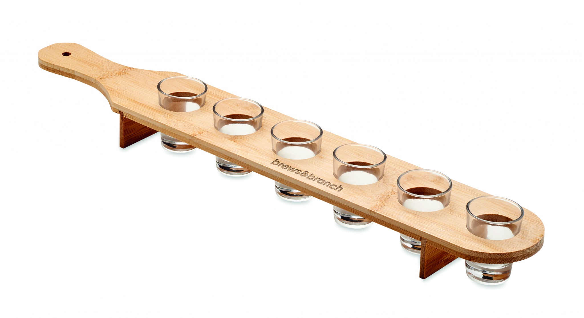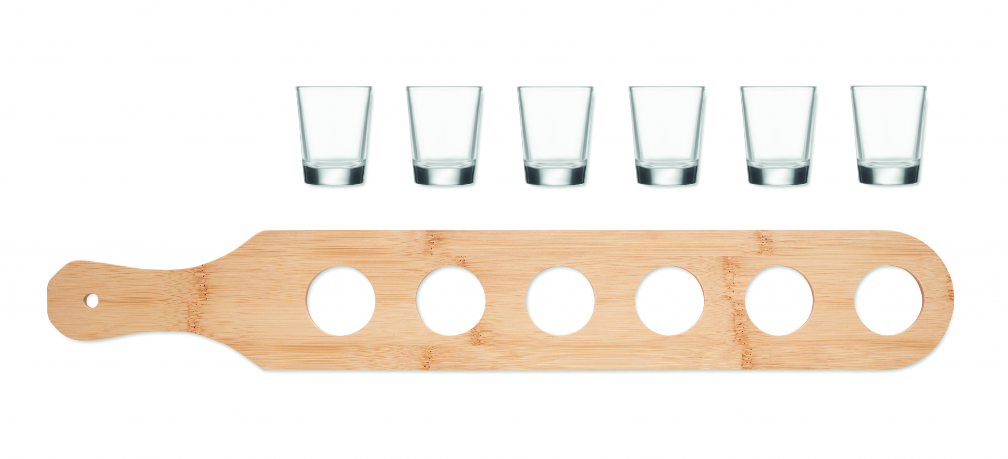 6 klaasist koosnev komplekt bambusest aerualusel. Mahutavus: 20 ml. Bambus on looduslik toode, ühe eseme värvis ja suuruses võib esineda väikesi erinevusi, mis võivad mõjutada lõppviimistlust.