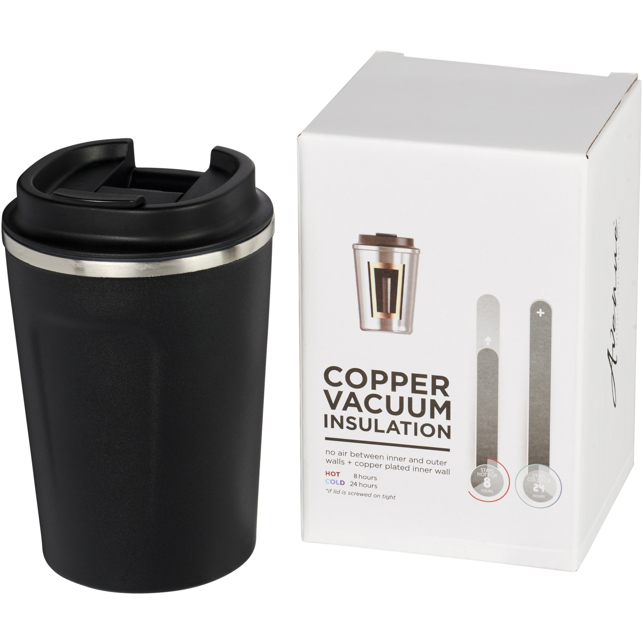 Kahekordse seinaga roostevabast terasest vaakumkonstruktsioon vaskisolatsiooniga, mis võimaldab jookidel püsida külmana 24 tundi või kuumana vähemalt 8 tundi. Konstruktsioon hoiab ära ka kondensaadi tekkimise kruusi välisküljel. Keeratav lekkekindel kaas. Trendikas vastupidav pulberkate. Maht 360 ml. Avenue kinkekarbis.