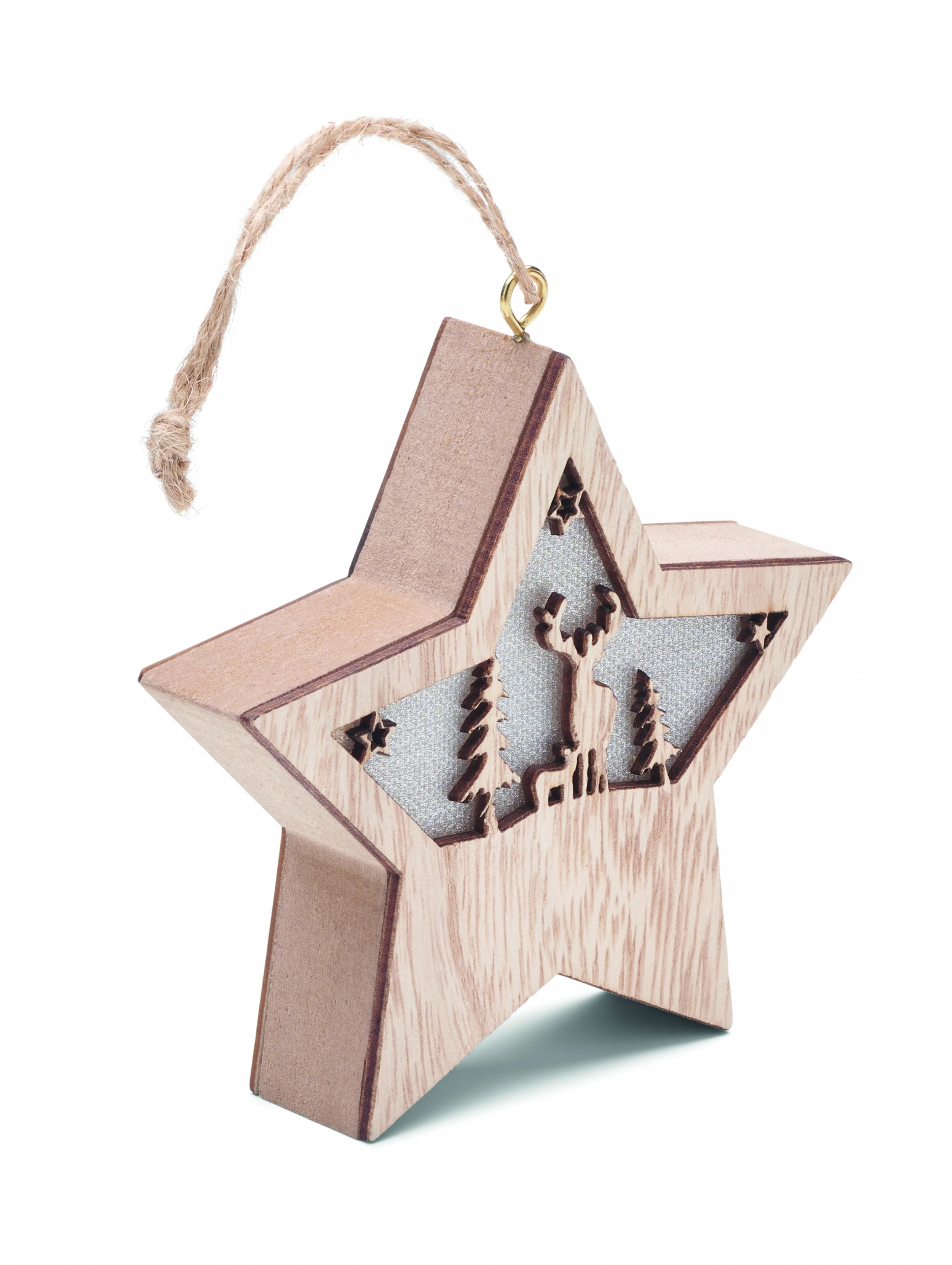 MDF-kaunistusega täht, mille sees on valgus, jõuluehete ja riputusnööriga. Kaasas 3 LR44 patareid.