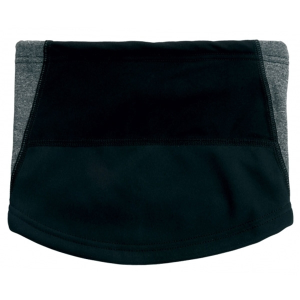 Multifunktsionaalne musta-halli värvi buff. See on valmistatud mustast venitatud fliismaterjalist (85% polüester, 15% spandex), hallist fliismaterjalist (92% polüester, 8% spandex) ja vooder pehmest fliismaterjalist (100% polüester).