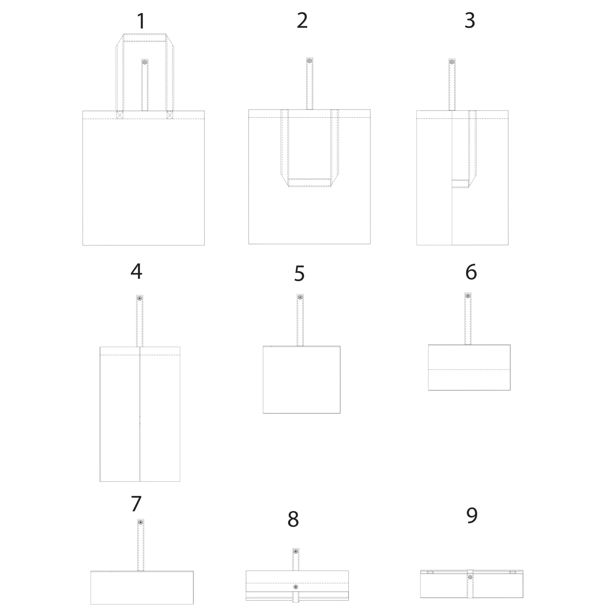 Avatud põhisahtli ja värviliste sangadega kandekott, mille kõrgus on 32 cm. Sellel on nööbiga suletav rihm, mis hoiab kotti kokkuvoldituna. Vastupidavus kuni 8 kg kaalule.