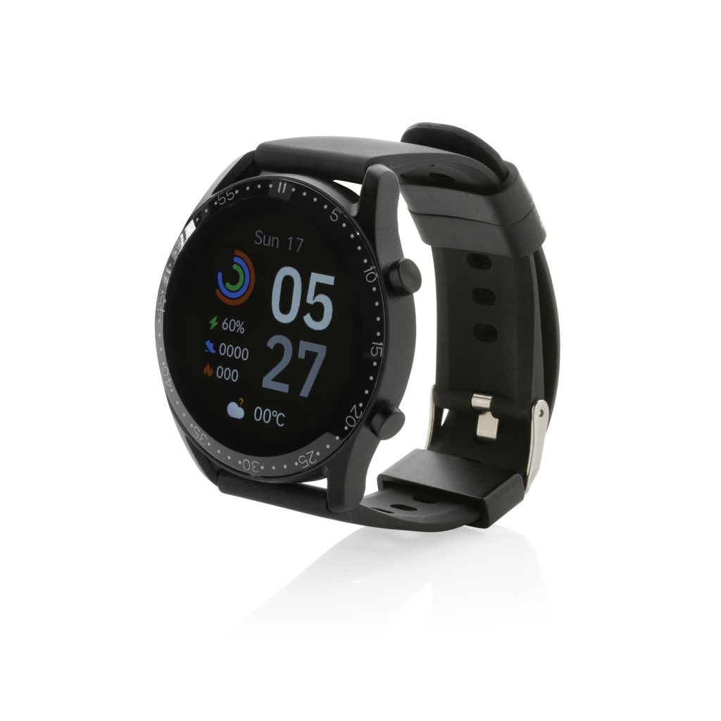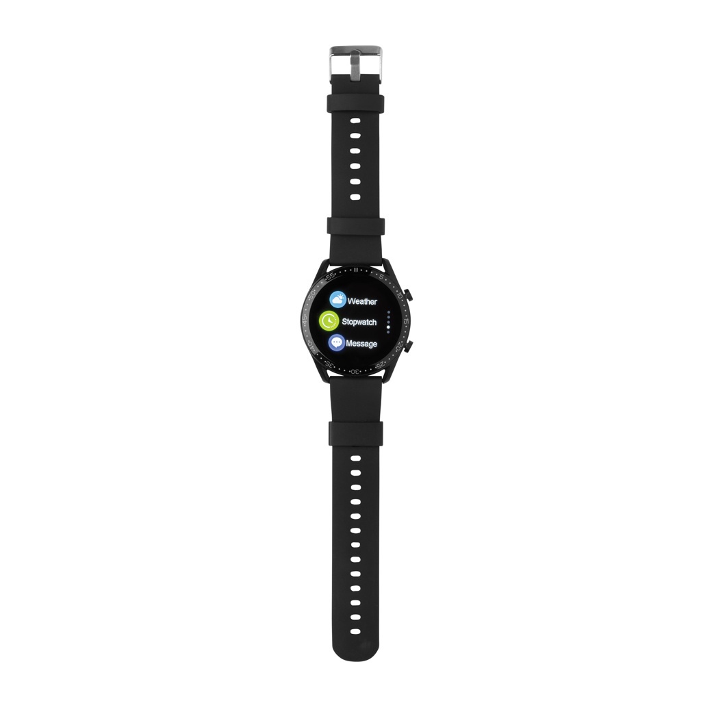 Moodne elustiilikell 1,28-tollise ümmarguse puutetundliku ekraaniga, et jälgida teie tegevusi kogu päeva jooksul. Integreeritud mikrofoniga telefonikõnedele vastamiseks kellas. Valmistatud RCS (Recycled Claim Standard) sertifitseeritud ringlussevõetud TPU käepaela ja metallraamiga. Taaskasutatud kogusisaldus: 22% eseme kogukaalust. RCS-sertifikaat tagab taaskasutatud materjalide täielikult sertifitseeritud tarneahela. Funktsioonide hulka kuuluvad: sammude arv, kalorid, distants, mitme spordiala jälgimine, äratuskell, pulsi jälgimine, vererõhu jälgimine, unemonitor, kalendrivärskendused, helistamine ja kõnede vastuvõtmine, märguanded: SMS, Facebook, Skype, WhatsApp, Twitter jne. Ühildub Android 4.4 ja IOS 8.0 ja uuemate versioonidega. BT 4.0. Ooteaeg 15 päeva ja tööaeg kuni 5 päeva. Kaasas klambrilaadija kella laadimiseks. Pakitud FSC® mix kraft pakendisse. Toode ja tarvikud 100% PVC-vaba.