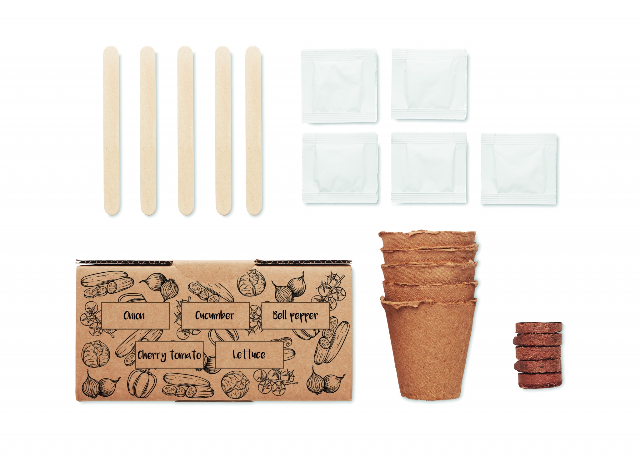 Salatikasvatuskomplekt. Karp sibula, kurgi, paprika, kirsstomati ja salatiseemnetega. Valmistatud EL-is. Ühendkuningriigis ei ole müügil. Kaasas mullatablett.