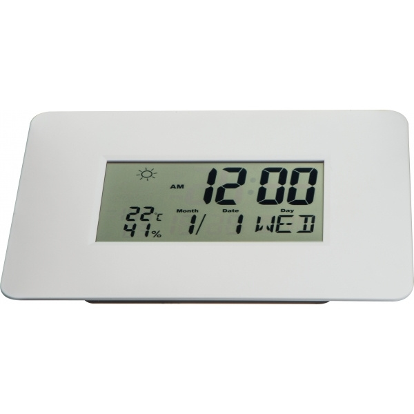 Digitaalne seinakell kalendri, äratuse ja edasilükkamise funktsiooni, termomeetri ja hügromeetriga (väärtuste automaatne värskendamine iga 20 sekundi järel) ja ilmanäidikuga. Eksklusiivsed 2 AAA patareid, tellige need korraga (artikkel 999400). temperatuur mõõdetakse F või C Tsükli seadistamine 12 tunnile (AM 12:00) või 24 tunnile (0:00) tuvastab temperatuuri vahemikus -50 kuni 70 CTuvastab hüdratatsiooni 20 kuni 89% kuvab 3 ilmarežiimi: päikesepaisteline, pilvine, vihmane