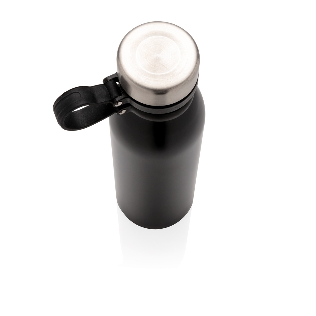 Lekkekindel vasest vaakumisolatsiooniga pudel musta silikoonist kandeaasaga. Ühe käega joomine tähendab, et kaant pole vaja hoida ega kaasas kanda. Kaasas kahekordse seinaga vaakumkonstruktsioon ja vase isolatsioon, mis tähendab, et see hoiab joogid kuumana kuni 8 tundi ja külmana kuni 24 tundi. Konstruktsioon takistab kondenseerumist pudeli välisküljel. Sisu: 600 ml.