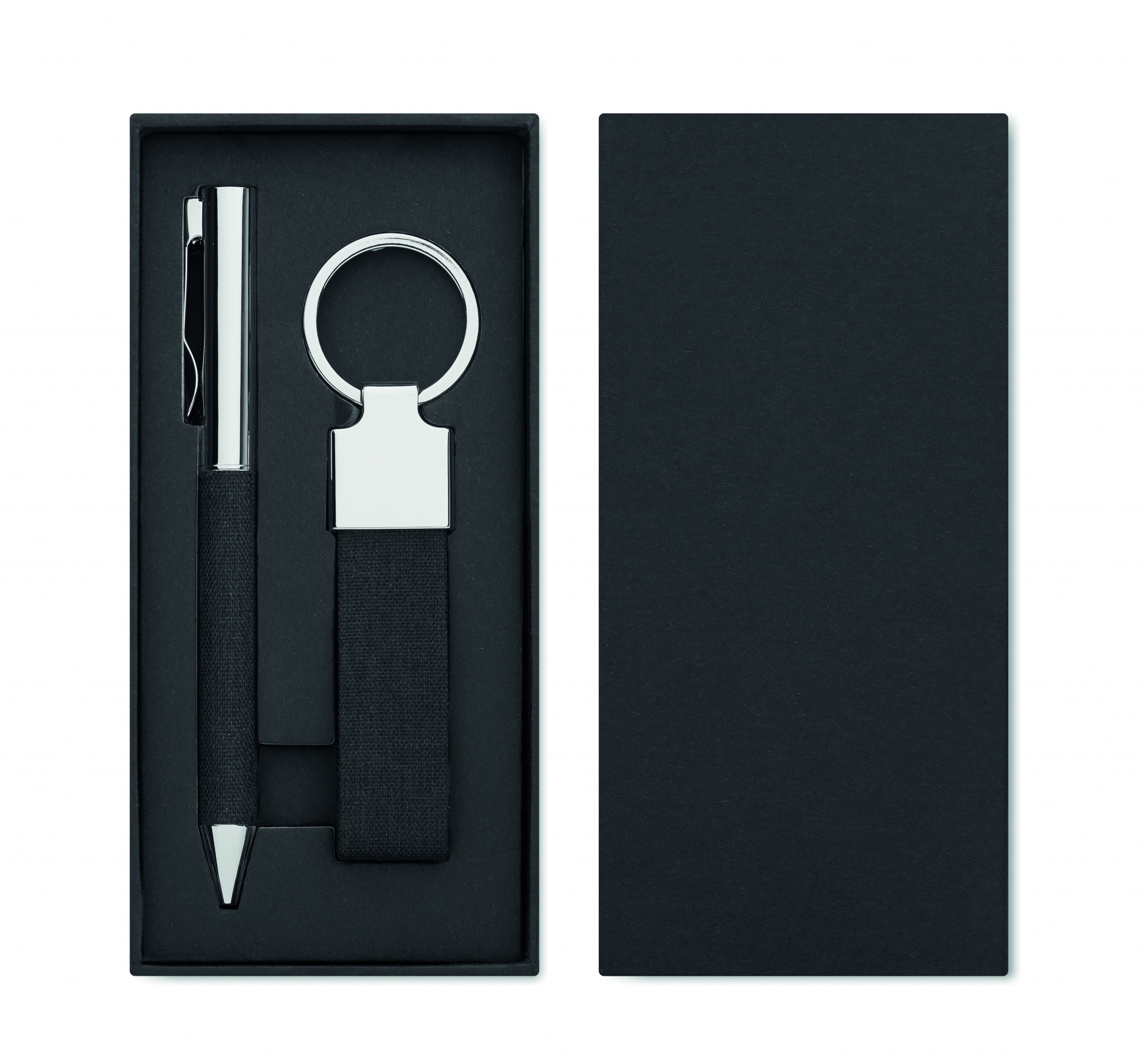 2-osainen lahjasetti lahjapakkauksessa. Sisältää metallisen kierrekuulakärkikynän, jossa on RPET-polyesteristä valmistettu yksityiskohta, ja RPET-polyesteristä valmistetun avaimenperän. Sininen muste.