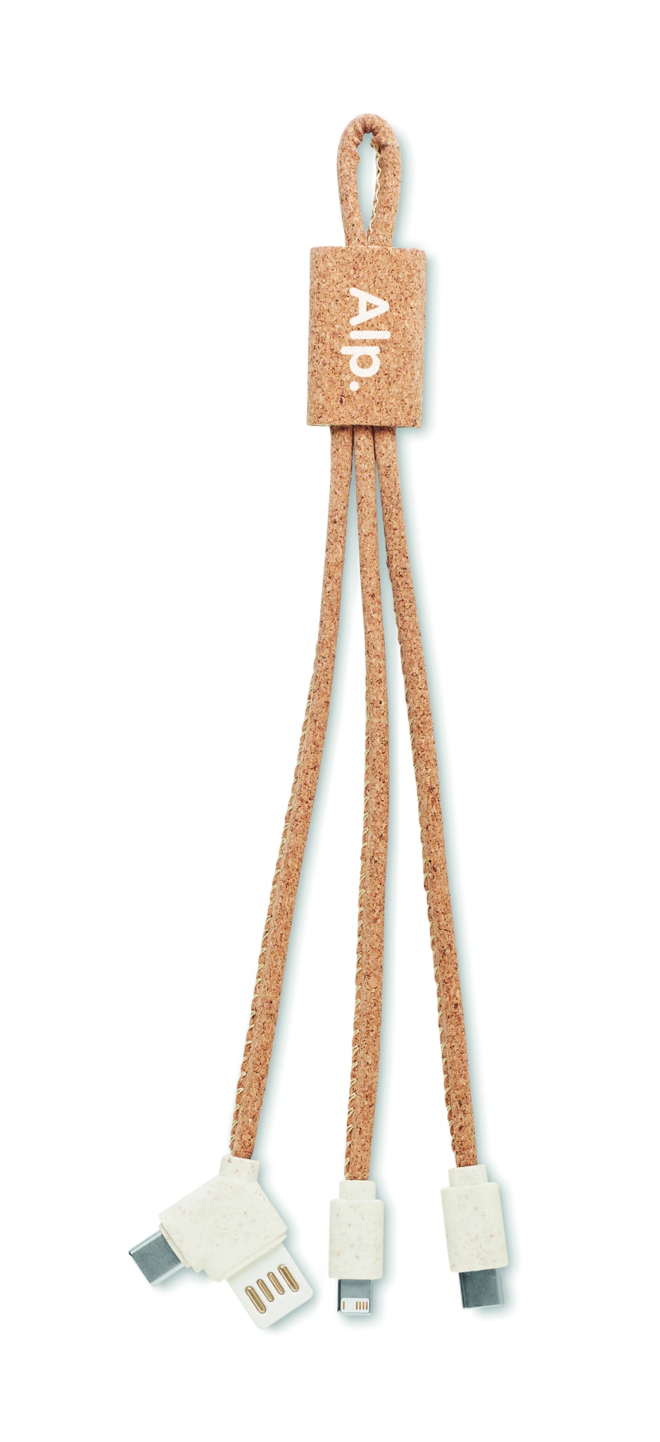 -3-in-1 -latauskaapeli korkkia. Tulo A-tyypin ja C-tyypin liitännällä, lähtö kolmella eri tyypin liitännällä, A-, B- C-tyyppi. Korkki on luonnonmateriaali, strukturaalinen laatu ja pinnan huokoisuus voi aiheuttaa eroavaisuuksia tuotteissa painatuksen jälkeen.