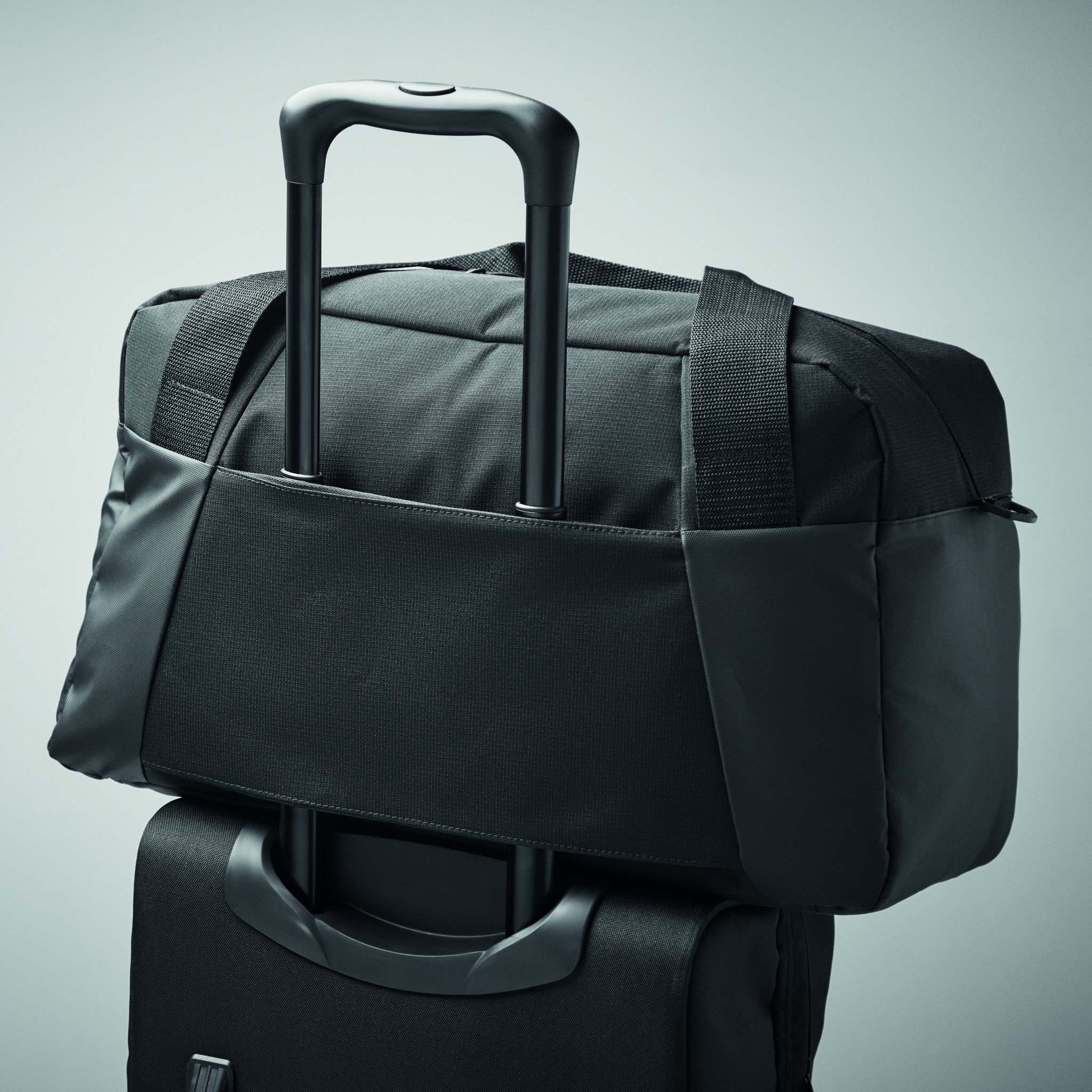 Matka/urheilukassi 300D ripstop-materiaalista PU-yksityiskohdilla. Laukussa on vetoketjullinen etutasku, sisätasku ja 2 pientä pehmustettua lokeroa. Trolleypidike takapuolella.