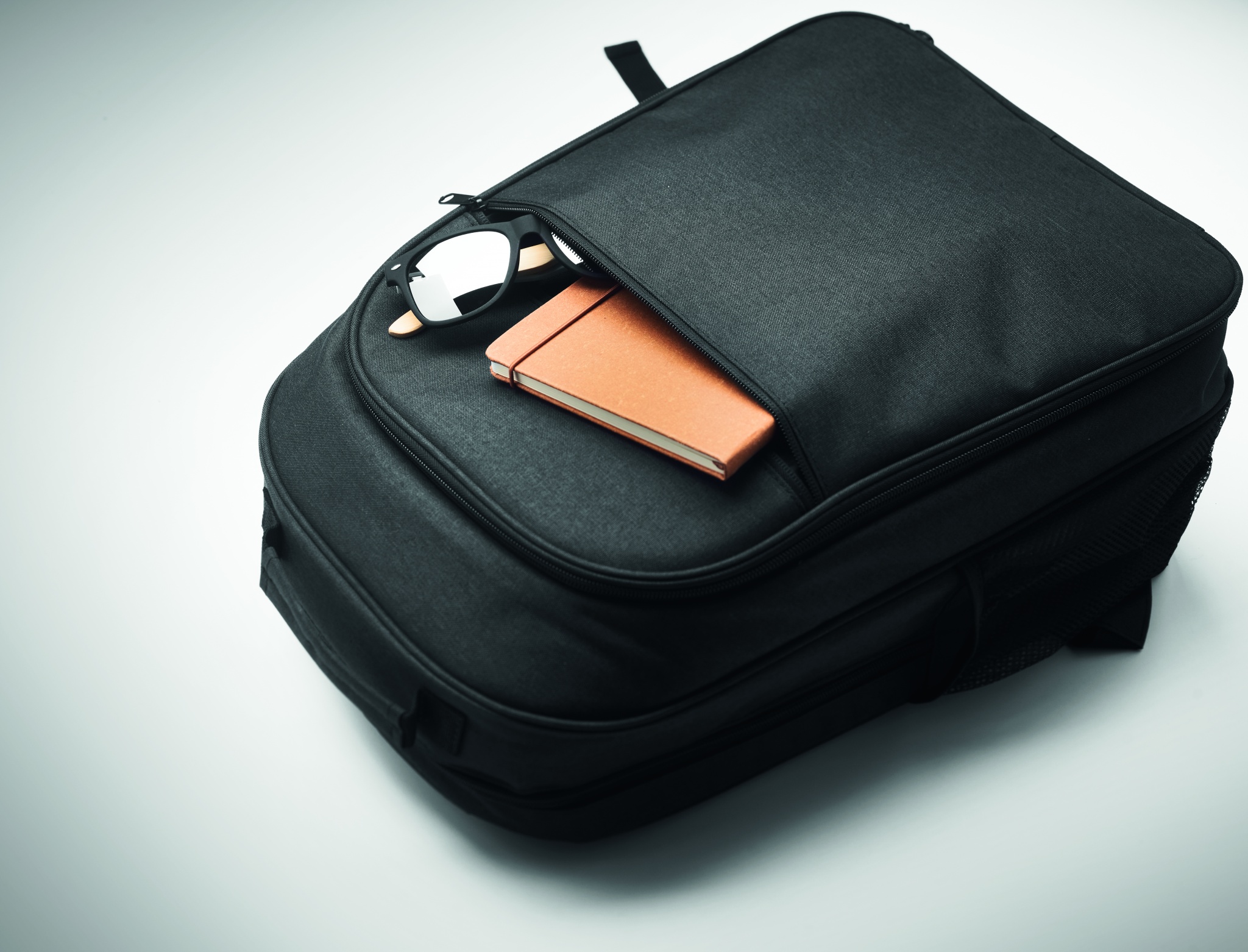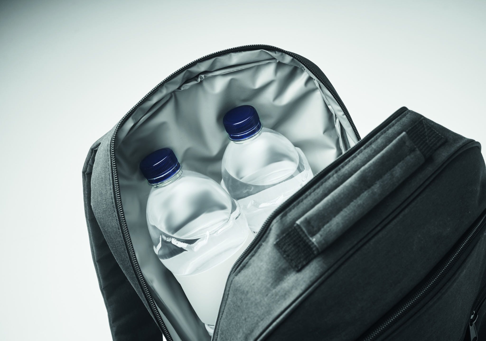 300D RPET-jäähdytysreppu, jossa on 15 tuuman kannettavan tietokoneen lokero. Vetoketjullinen etutasku ja yksi sivussa oleva verkkolokero.