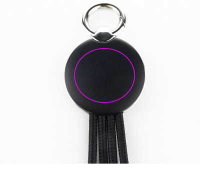 Latauskaapeli, sisältää 3 pistoketta: micro USB, lightning ja type-C. Kaiverrettu logo näkyy valaistuna, kun kaapeli on käytössä.