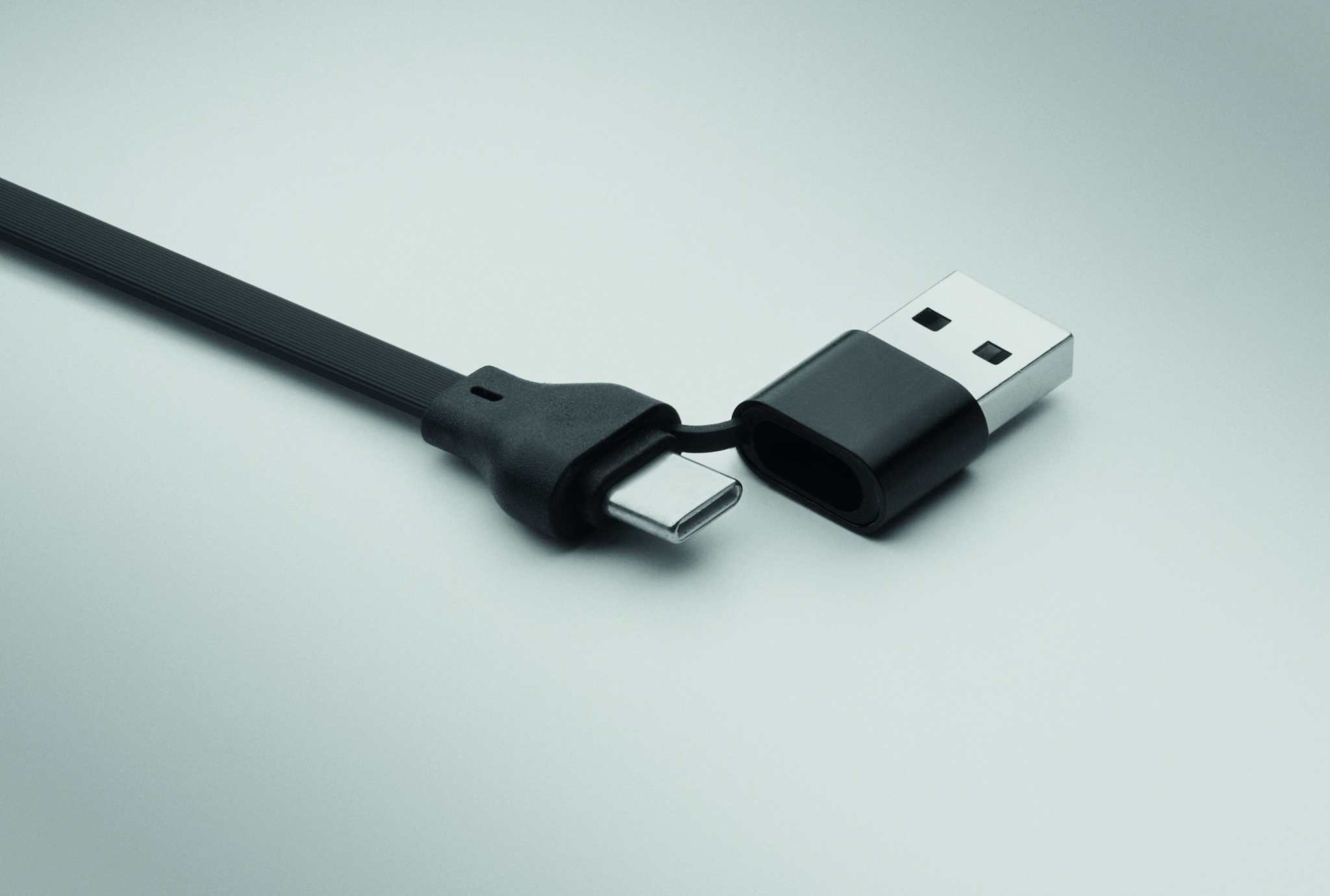 60 W kaapeli kierrätetyssä ABS-kotelossa avaimenperällä ja puhelintelineellä. Tulo: 2-in-1 Type-C ja Type-A. Lähtö: Type-C ja micro-B (2 in 1 pin). Kaapelin pituus: 26 cm.