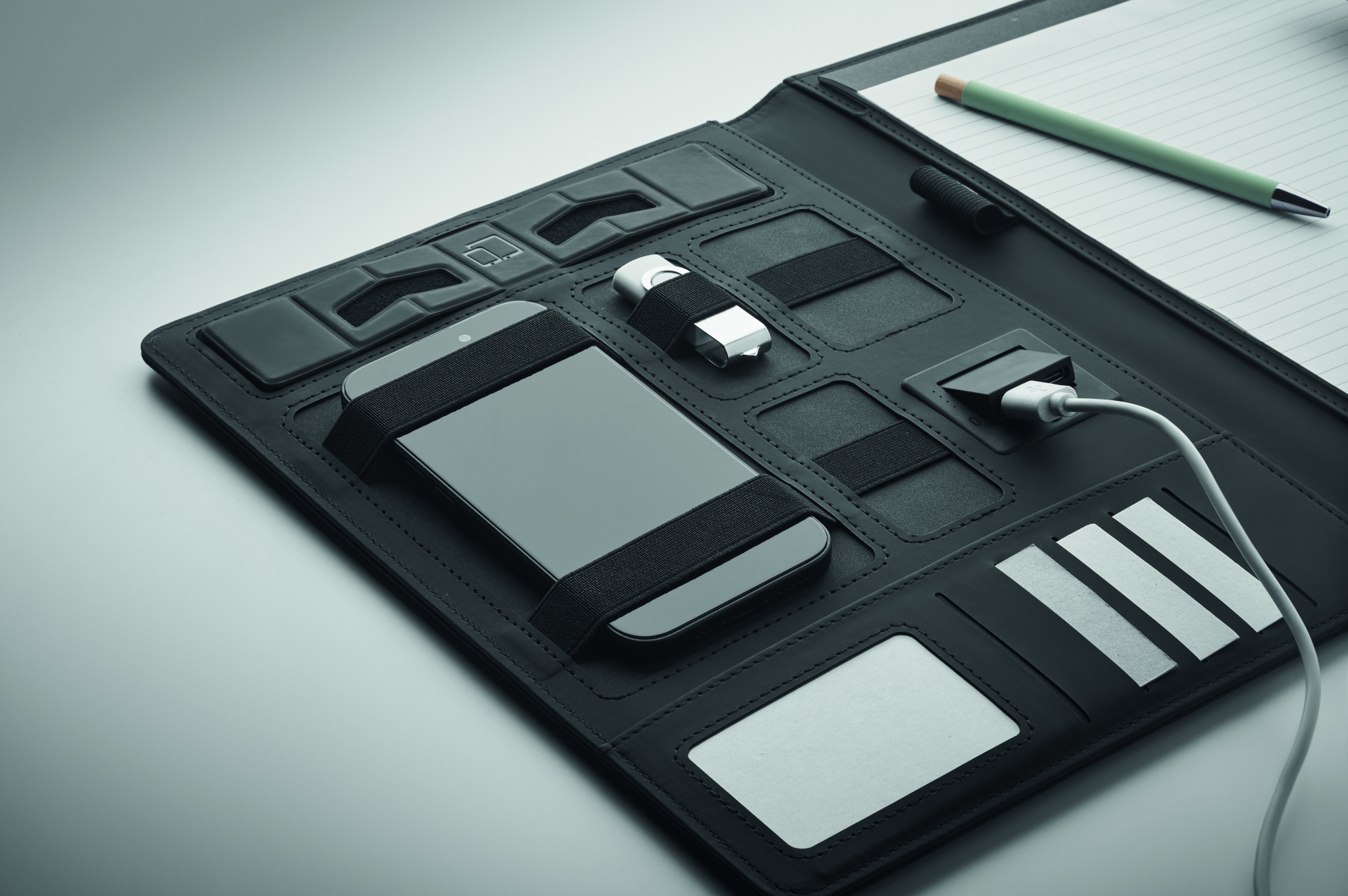 A4-kokoinen neuvottelukansio pellava-PU-kuorella. 5000 mAh virtapankki ja 15 W magneettinen langaton laturi. 20 arkin muistilehtiö. Useita sisäisiä lokeroita. Magneettinen suljin. Elastinen kynäteline.