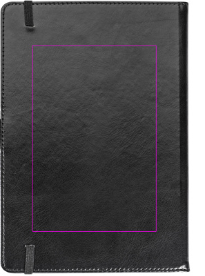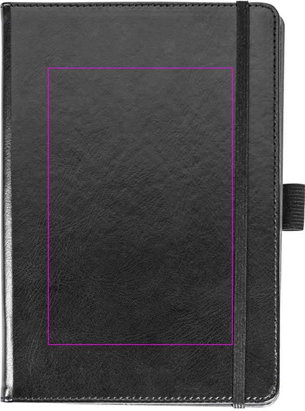 Nahkajäljitelmä A5-muistivihko, jossa 80 vuorattua sivua, 4 sisäänvedettävää lokeroa ja kynälenkki. Painamme logosi kanteen.