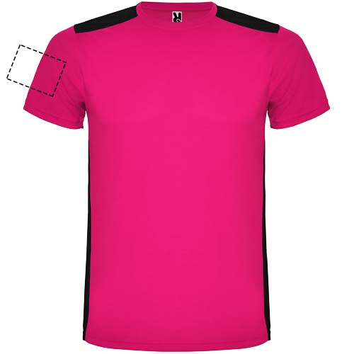 Helposti kuivuva, tekninen ja hengittävä kangas. Pyöreä kaula-aukko. Kahden polyesterikankaan yhdistelmä selässä ja olkapäissä. Bird's eye -kangas edessä ja hengittävä 3D-verkkokangas takana. Kangas, joka on suunniteltu imemään kosteutta. Sivuilla ja olkapäillä koristeellinen siksak-selkätikki. Selkäosa hieman pidempi. Irrotettava etiketti.