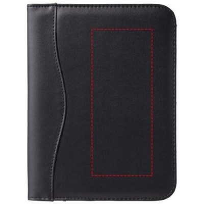 Kansiossa on kynälenkki, asiakirjataskut ja 20 viivoitettua muistipaperia. Kynä ja tarvikkeet rekvisiittaa.