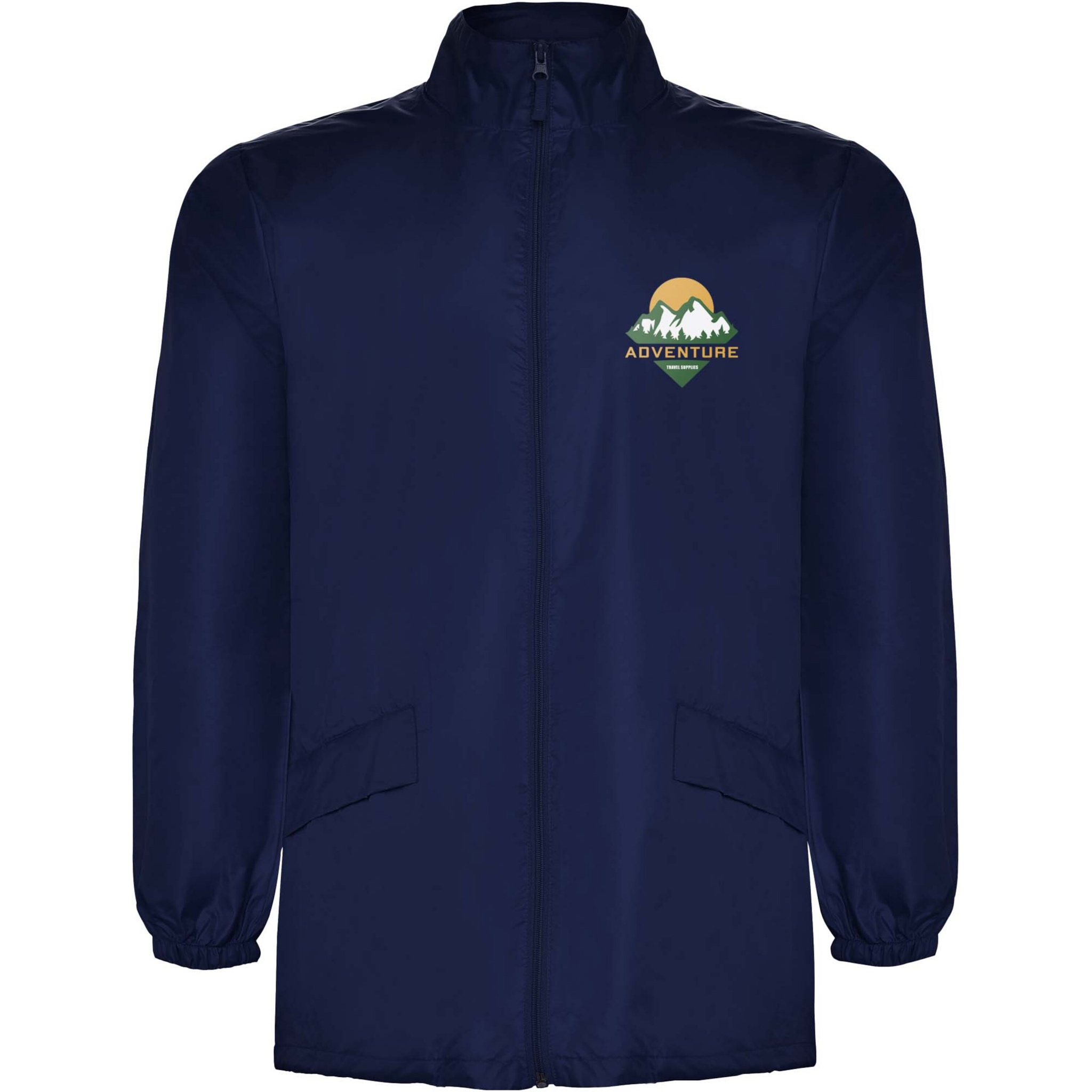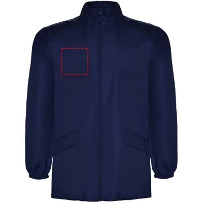 Vedenpitävä sadetakki. Korkea kaulus ja irrotettava huppu säädettävillä nauhoilla. Keskellä vetoketju ja saman sävyinen vedin. Kaksi sivutaskua suojaavilla listoilla. Joustavat hihansuut. Joustava nauha tasku sisäpuolella viikkaamista ja säilytystä varten. Kuvan malli on 185 cm pitkä ja hänellä on päällään koko L.
