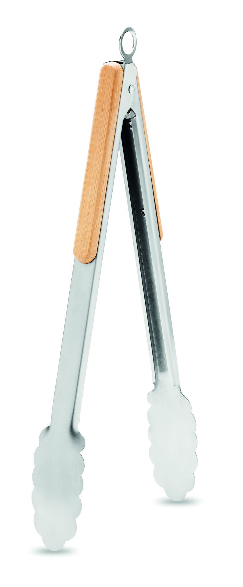 Ruostumattomasta teräksestä valmistetut grillipihdit bambukahvoilla. Lukitusmekanismi.
