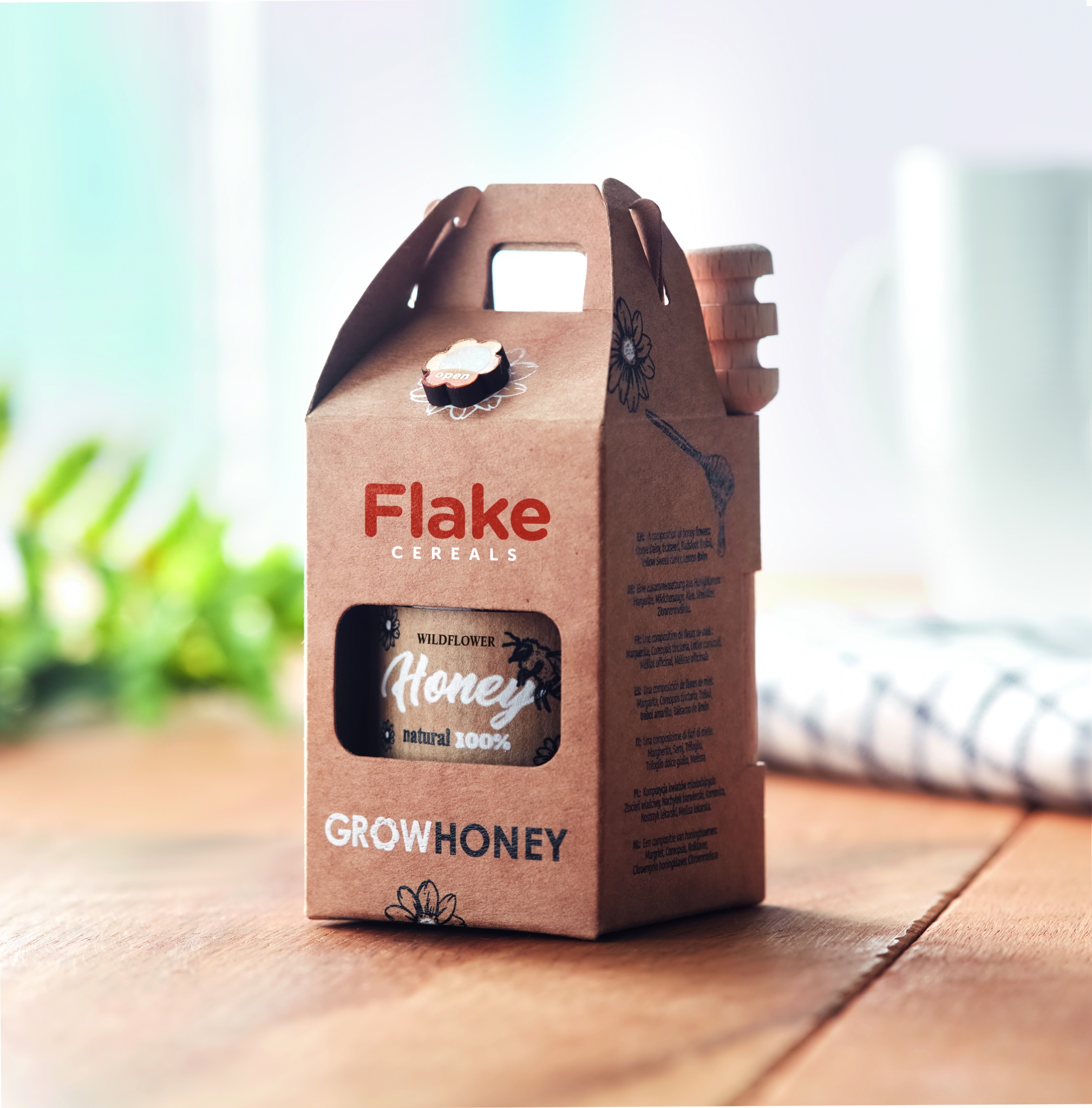 Luonnonkukka 50 gr hunajapurkki ja hunaja lusikka. Sisältää villikukan siemeniä, pakattuna voimapapperi pakkaukseen. Eurooppa tuotantoa.