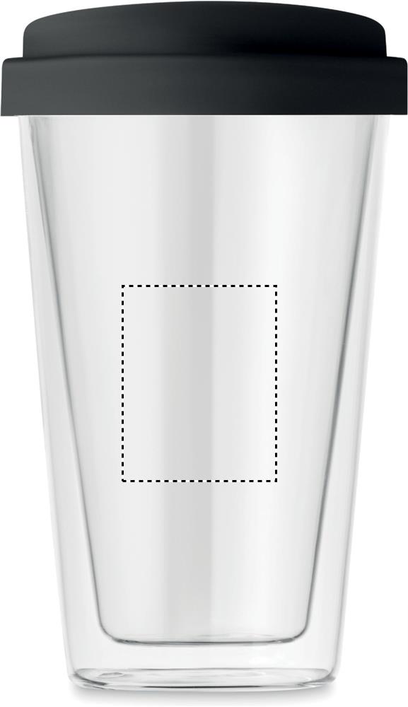 Kaksiseinäinen 350 ml borosilikaatti juomalasi, silikonisella kannella.