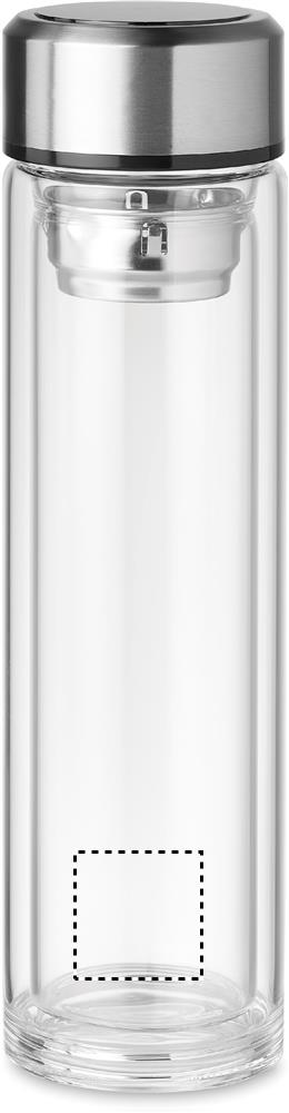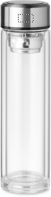 Kaksiseinäinen 390ml borosilikaattilasipullo, korkissa LED- kosketusnäyttö lämpömittari ja -sisällä irroitettava teesiivilä. Sisältää CR2032 patterin, tuote on vuoto vapaa. Borosilikaattilasiin ei voi kaiverruttaa.